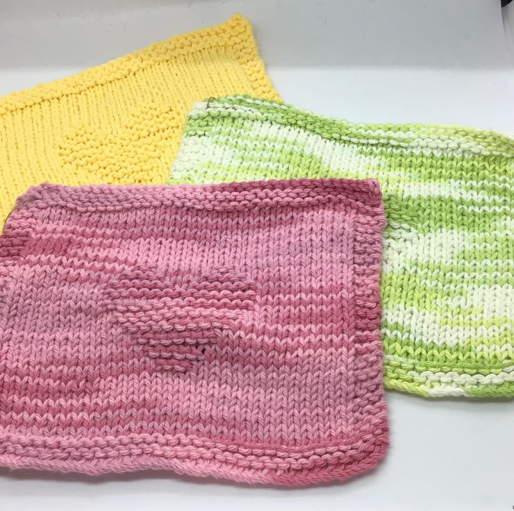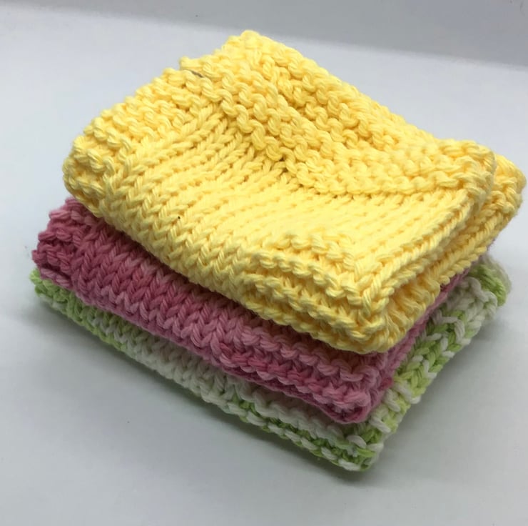 A bundle of 3 hand knit cotton dishcloth or washcloths measuring approximately 8” x 9” each. Colours as shown.