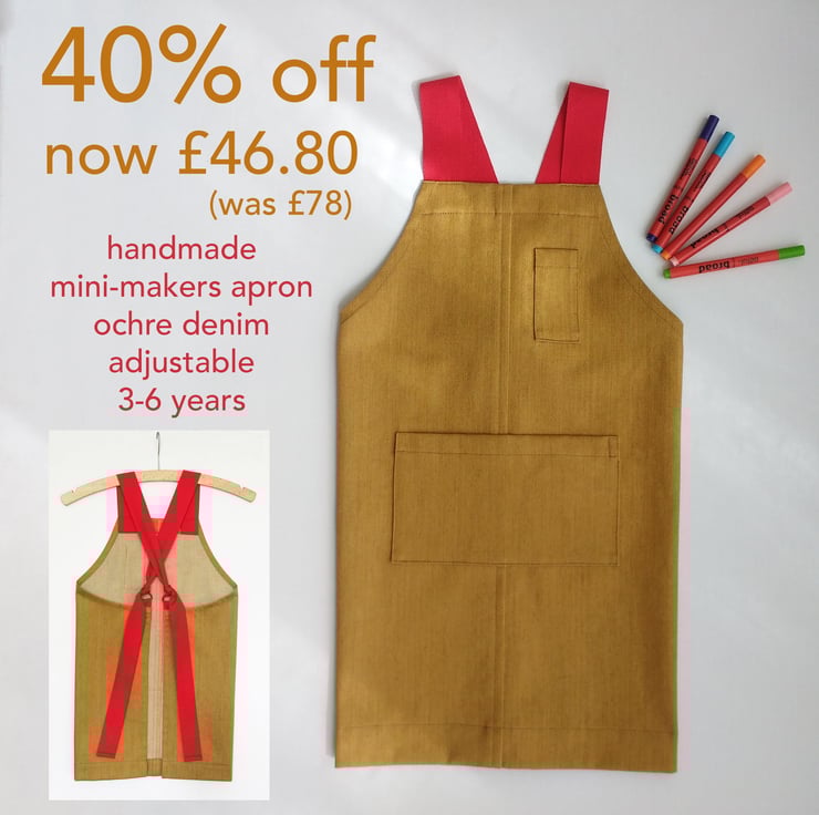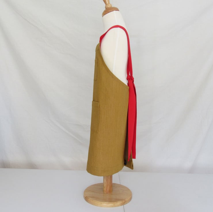 ARCHIVE DESIGN JUST 2 LEFT! Handmade cross back apron for mini-makers, made in golden ochre denim with red herringbone tape tie straps. A comfortable and adjustable apron made for creative kids, that will grow with them. Suitable for art, craft, baking, gardening, pet care etc. Utmost attention is paid to detail, finish and strength of construction, it's made-to-last.