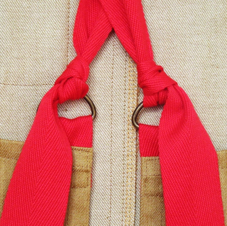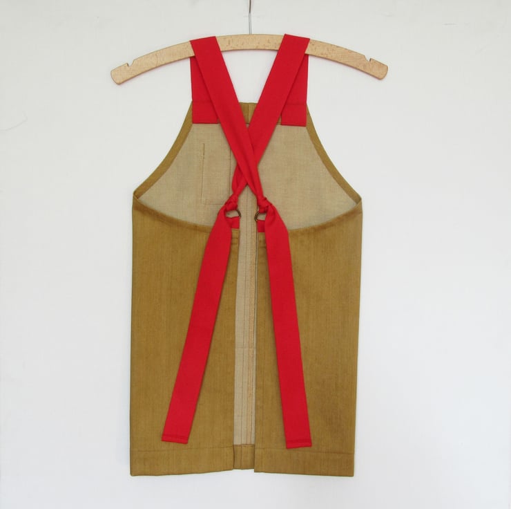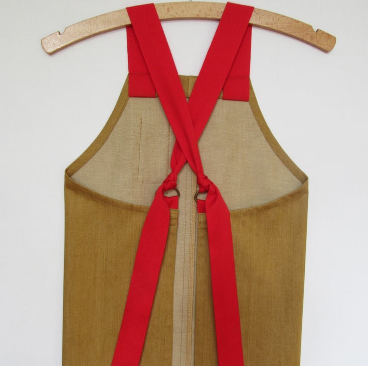 This No7:1 design was my second ever cross back makers apron design, I used the same shape as the first cross back apron but this time added adjustable straps made of herringbone webbing which knot through loops at the back corners of the apron. This beautiful golden denim and red webbing is such a striking combination on this design.