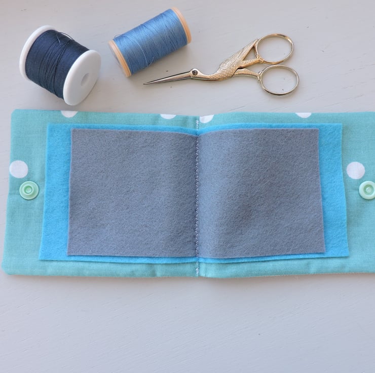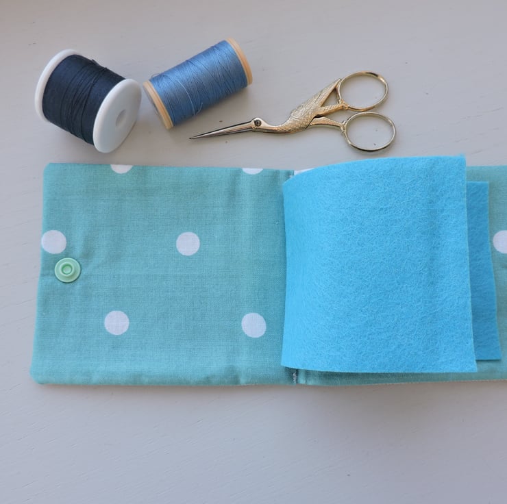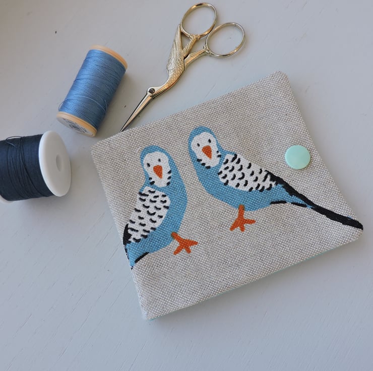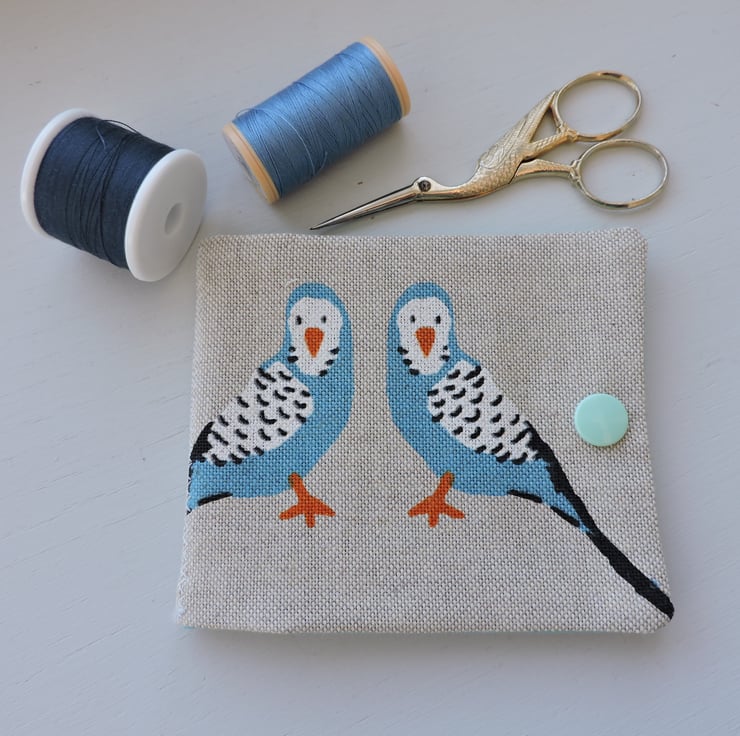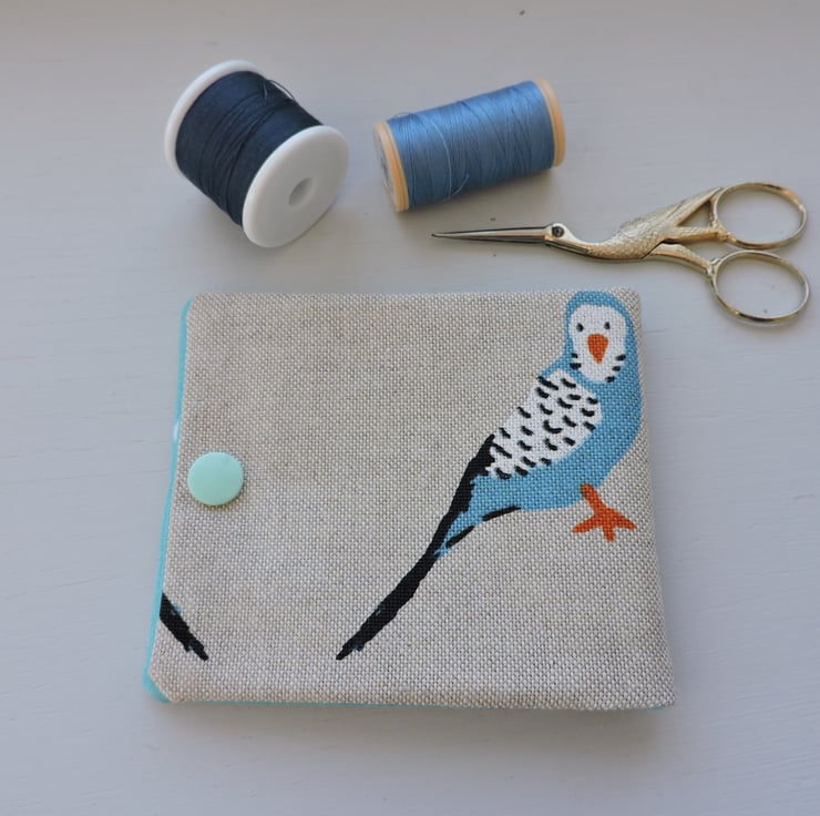 I've made this little sewing needle case from a cotton duck fabric with an oatmeal background and turquoise blue budgies for the outer of the case and a cotton turquoise fabric with white spots for the inner.