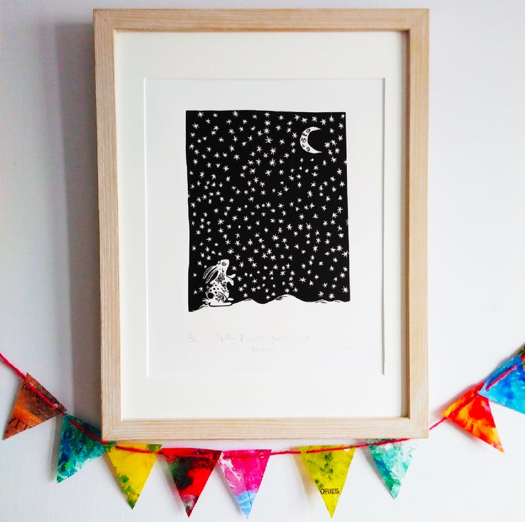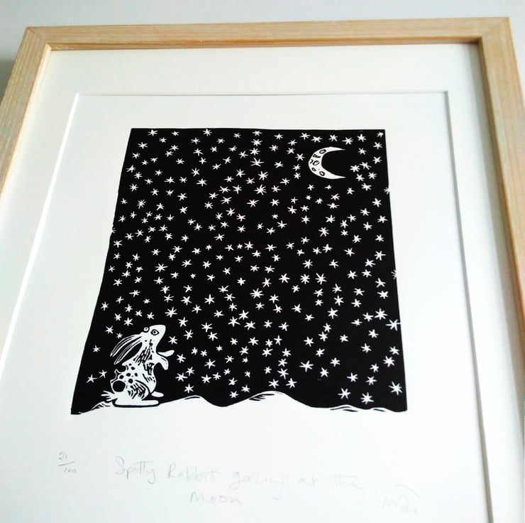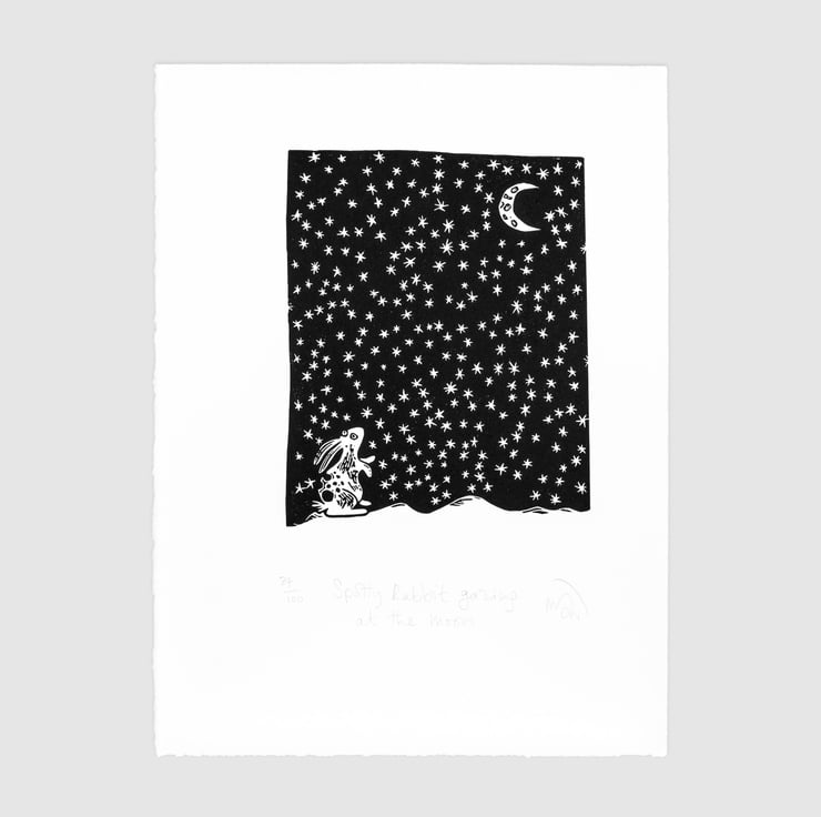 This lino print is of a little spotty rabbit gazing up into the night sky...