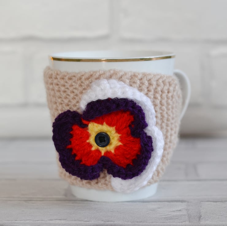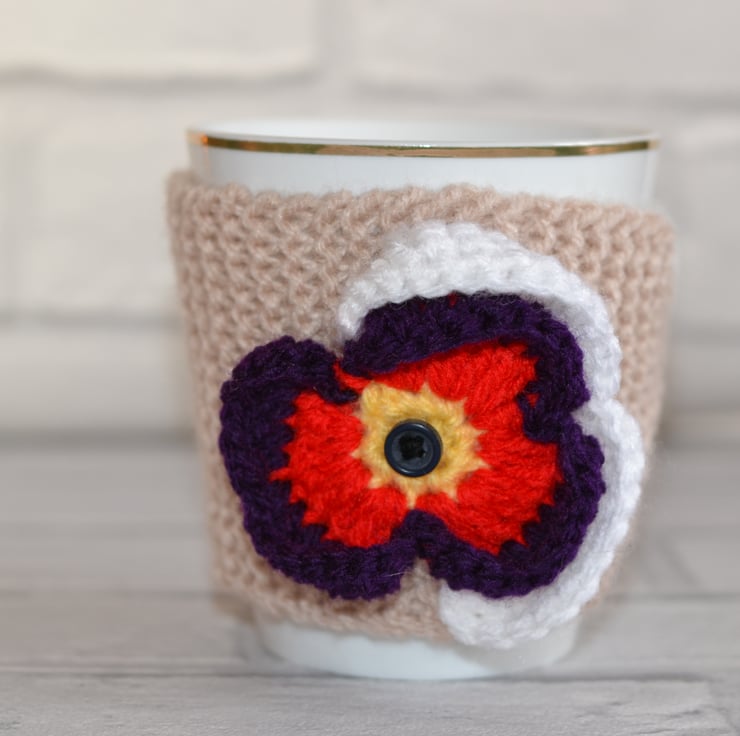 Knitted in stone with a hand crocheted pansy in white, red, purple and a yellow centre and a black button.