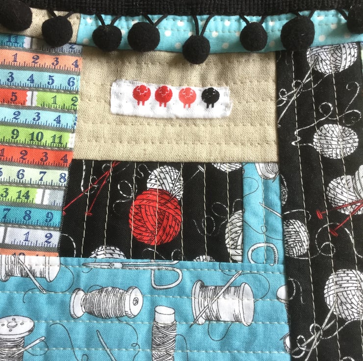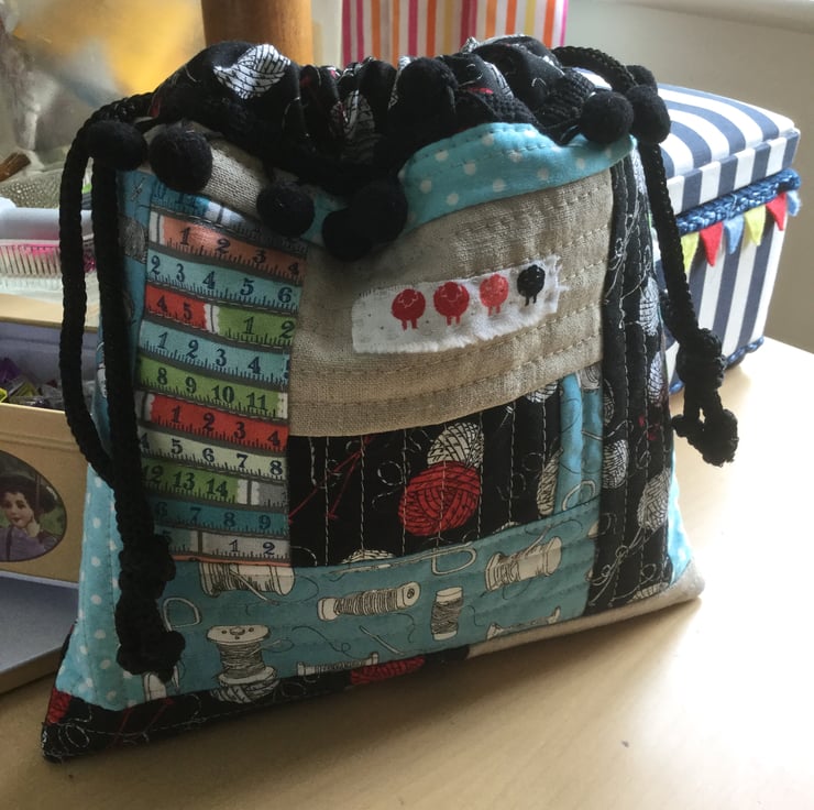 This fun little draw string bag has a front created from quilted fabric scraps on a crafting theme. In mainly dark colours of black, blue and grey with pops of colour in green, red, orange and white. I have even used the selvedge with a little pattern of sheep for embellishment.