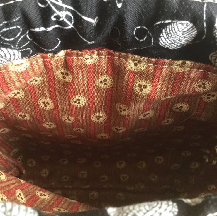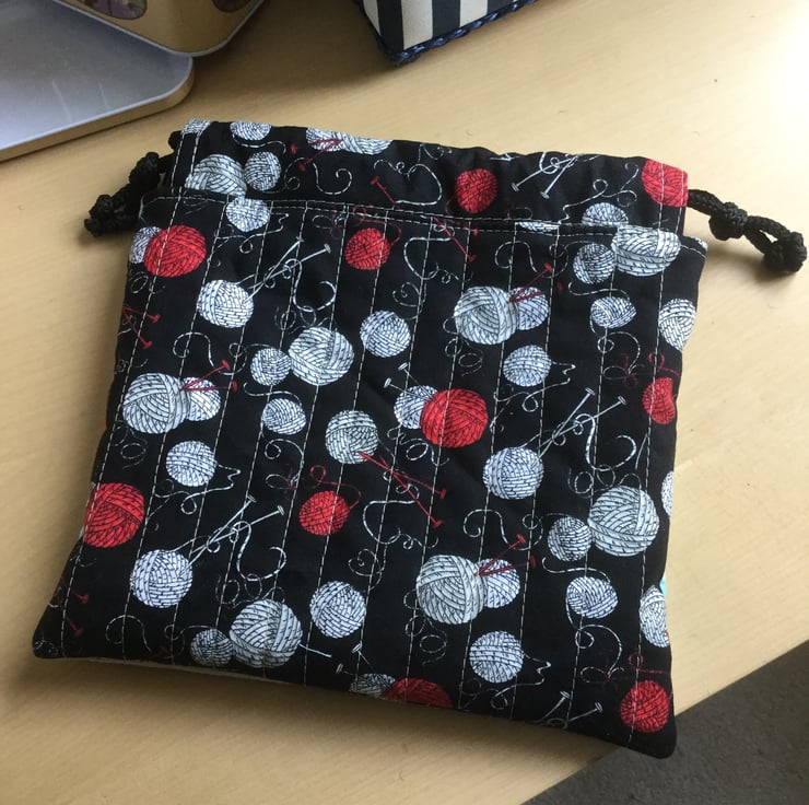 The back of the bag is made of one piece of quilted fabric with a black background with a design of balls of wall and knitting needles in red and white. A line of black pompoms decorate the front of the bag and black nylon cord create the drawstring.