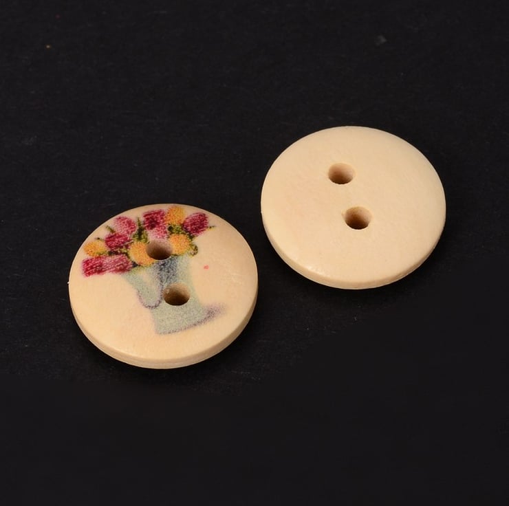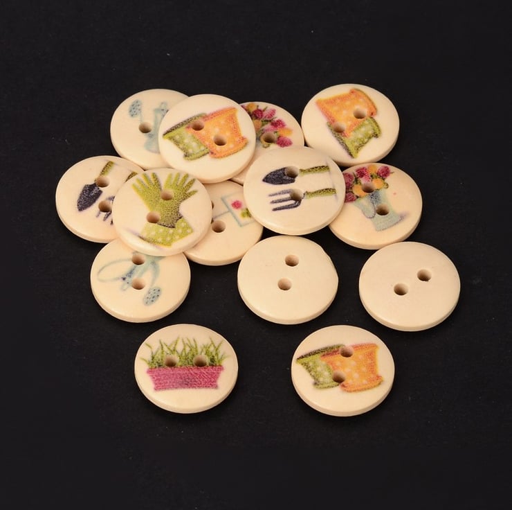 Each button is printed to one side with a a gardening inspired image , there are gardening gloves, flower pots, watering cans, boots, tools with two central holes.