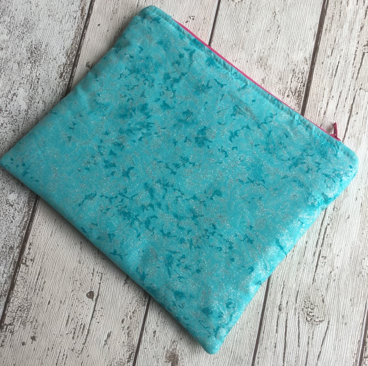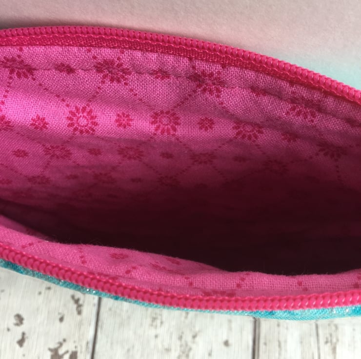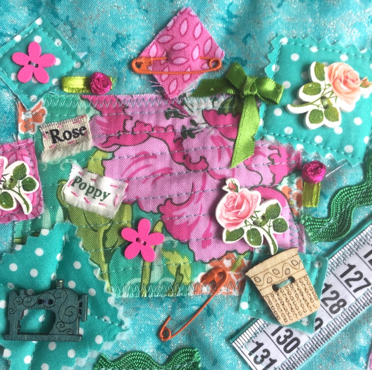 If you like something unusual and pretty then this little zipped pouch is for you. The beautiful cotton fabric in a marbled turquoise has a silver thread running through it which gives a sparkly effect. The front of the bag has been decorated with a collage of sewing themed items from pieces of fabric, novelty buttons, ribbon roses, a tape measure, ribbon, trimmings and safety pins, in shades of pink, green, orange, black and white. All items have been sewn into place, including the safety pins and covered with a piece of clear vinyl.