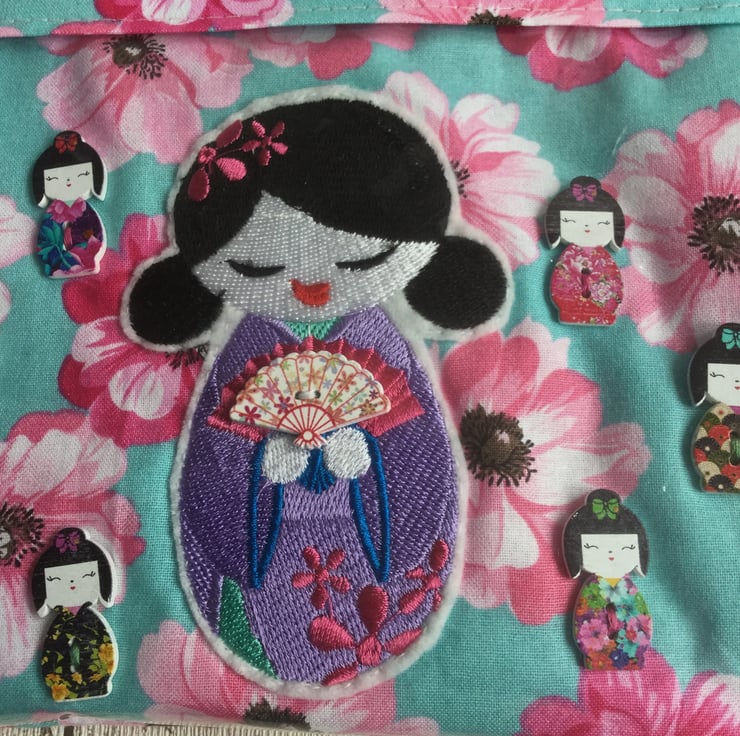 It started with the machine embroidered figure that a local lady makes and gives to a charity shop to sell. Together with the novelty buttons and the fabric that reminds me of the famous cherry blossom season in Japan the concept of the bag came together. Japan is near the top of my list of places to visit.