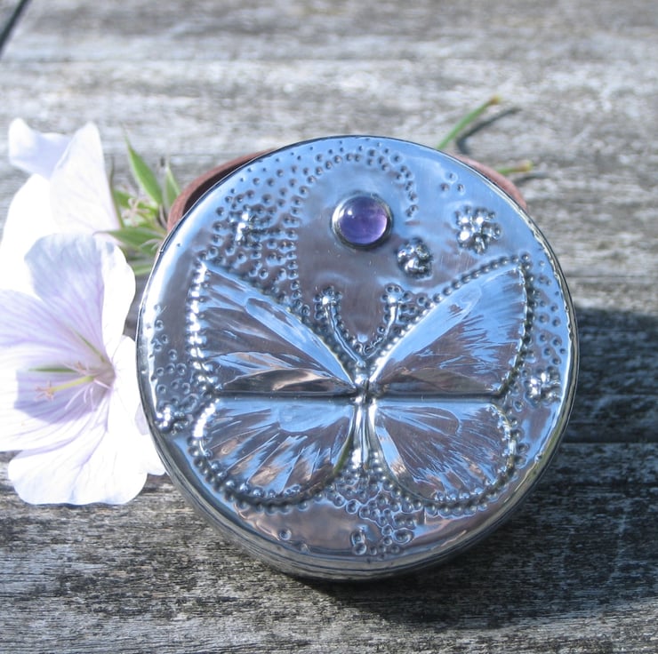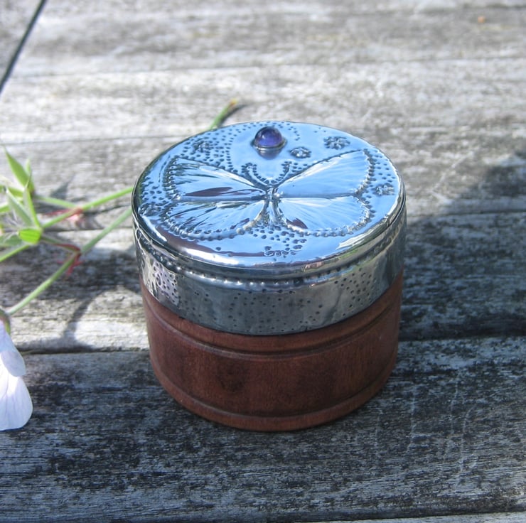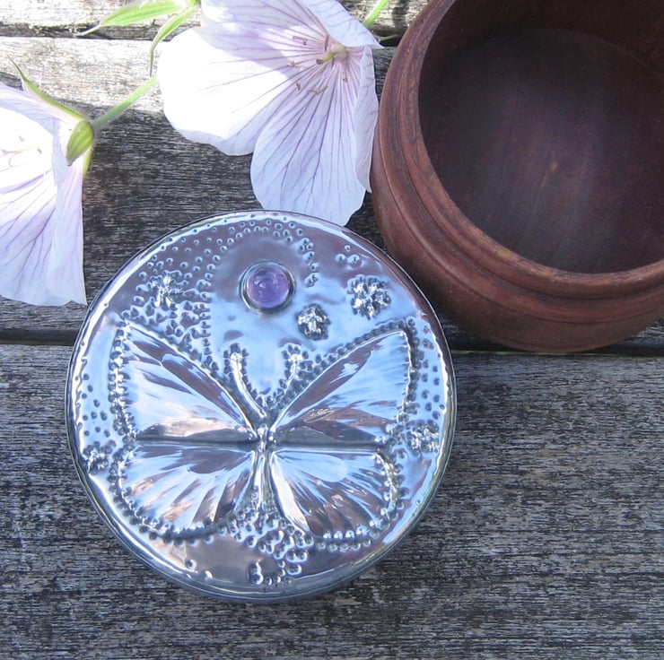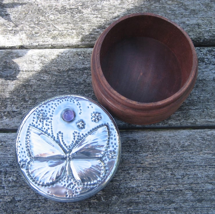 This simple round wooden box has been transformed into something unique and special with a lid of hand-tooled pewter. My butterfly design has been raised with a box-wood tool using the repousse method, popular with the Arts and Crafts movement. The raised area has been filled and the piece of pewter has been mounted on the base, in this case the lid of this wooden box.