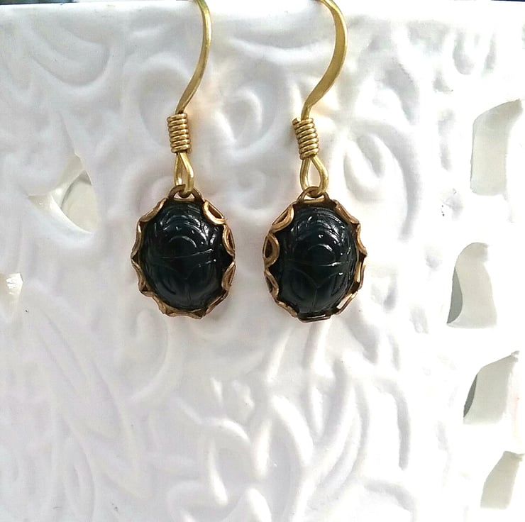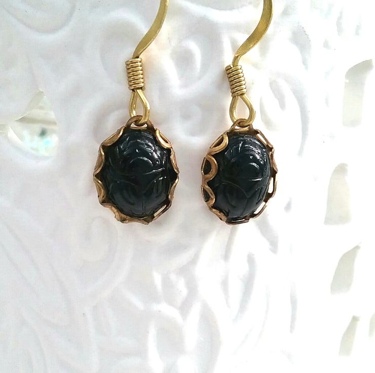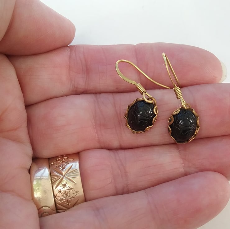 Sweet little black beetle cameo earrings beetle detailing set into
