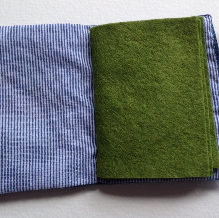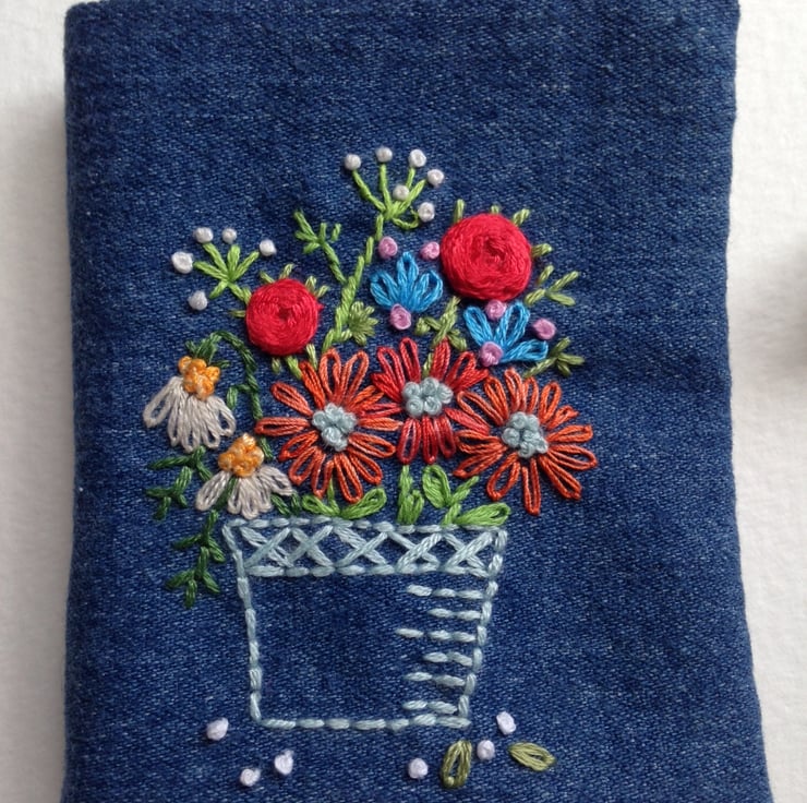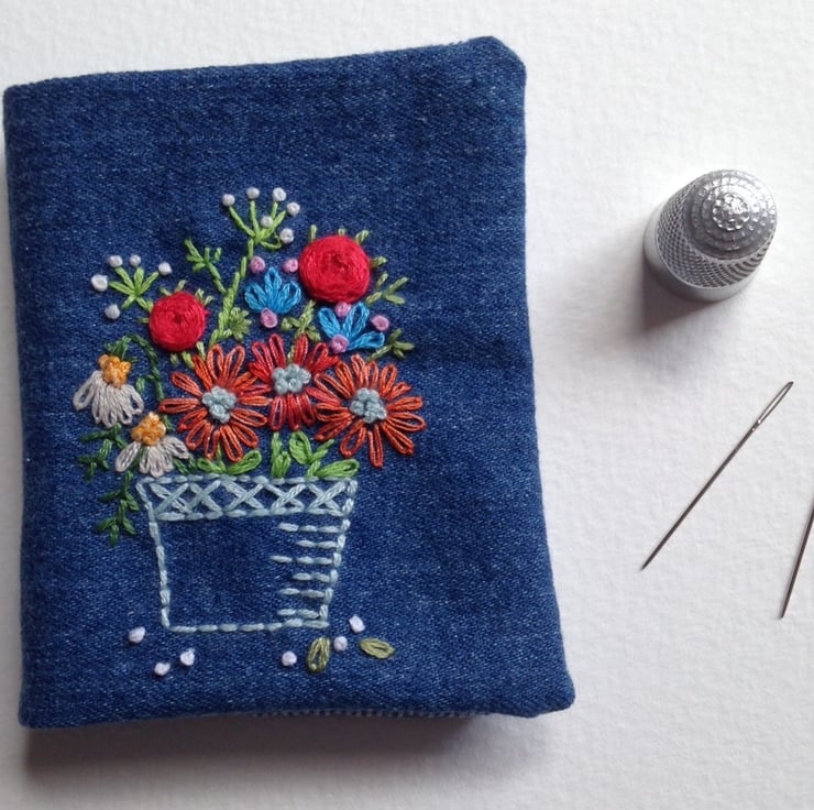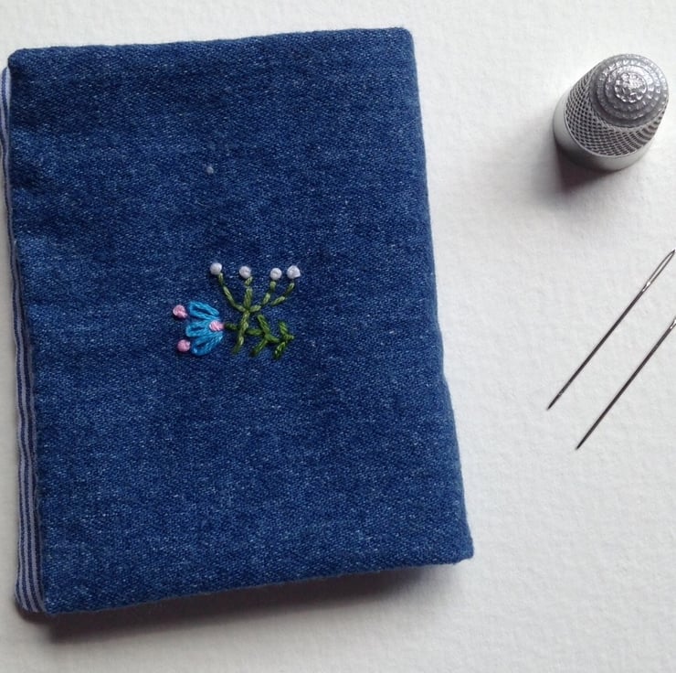 This hand sewn needle case is made from denim and lined with stripy cotton. The 4 pages are made from green felt. It measures 8cm by 9.5 cm when closed . I have embroidered a pot of flowers on the front and a few sprigs of flowers on the back.