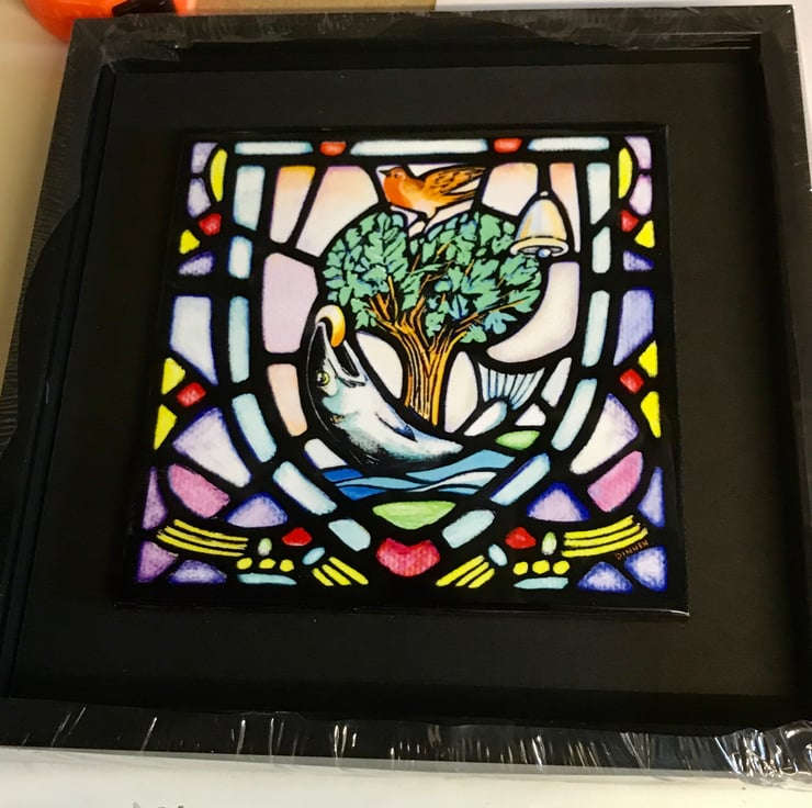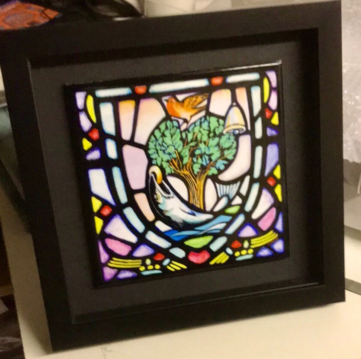Framed 9x9” tile of Glasgow Coat of Arms featuring artwork based in design from Glasgow Cathedral stained glass window. The medieval design has been reconfigured , recoloured and modernised by Glasgow artist James Dinnen
