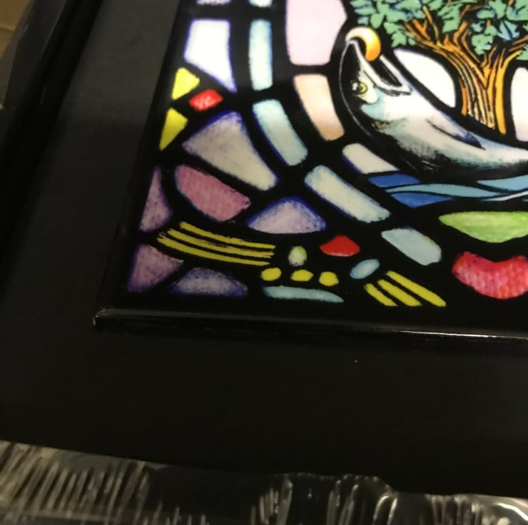 Inspired by a stained glass window in Glasgow Cathedral. The original design image has been reconfigured with a modern twist with Colour and enhanced artwork by artist James Dinnen to produce this stunning framed semi gloss ceramic tile