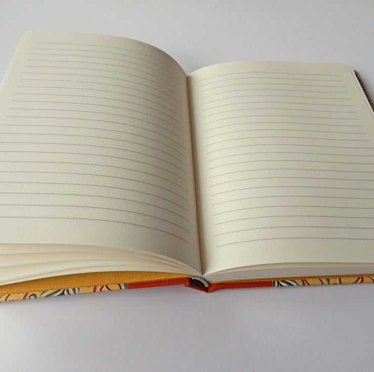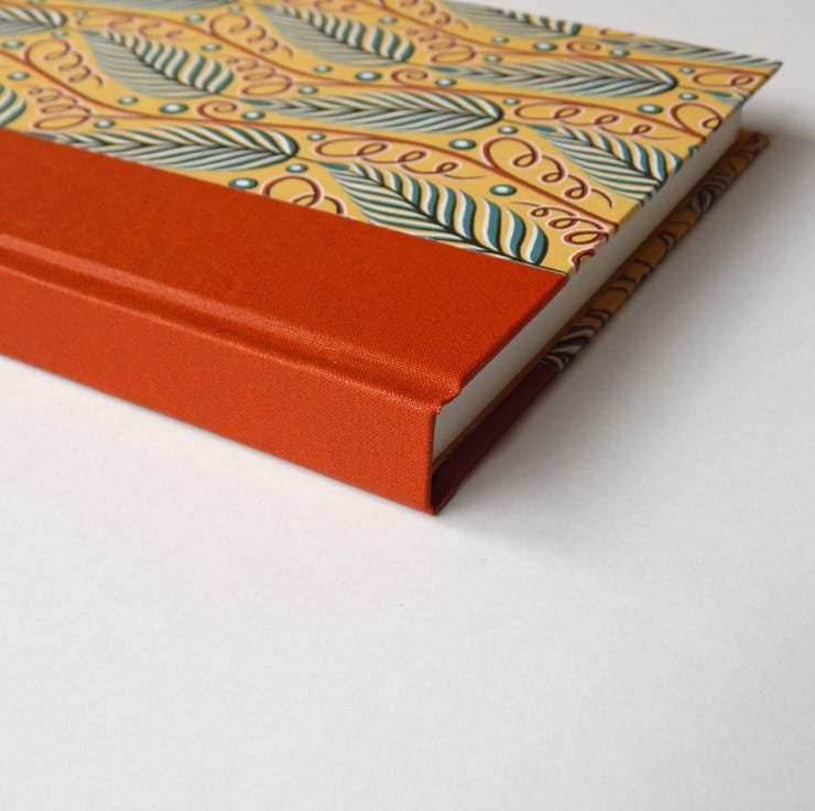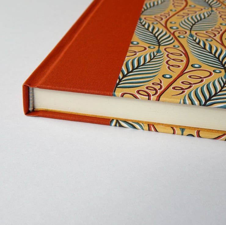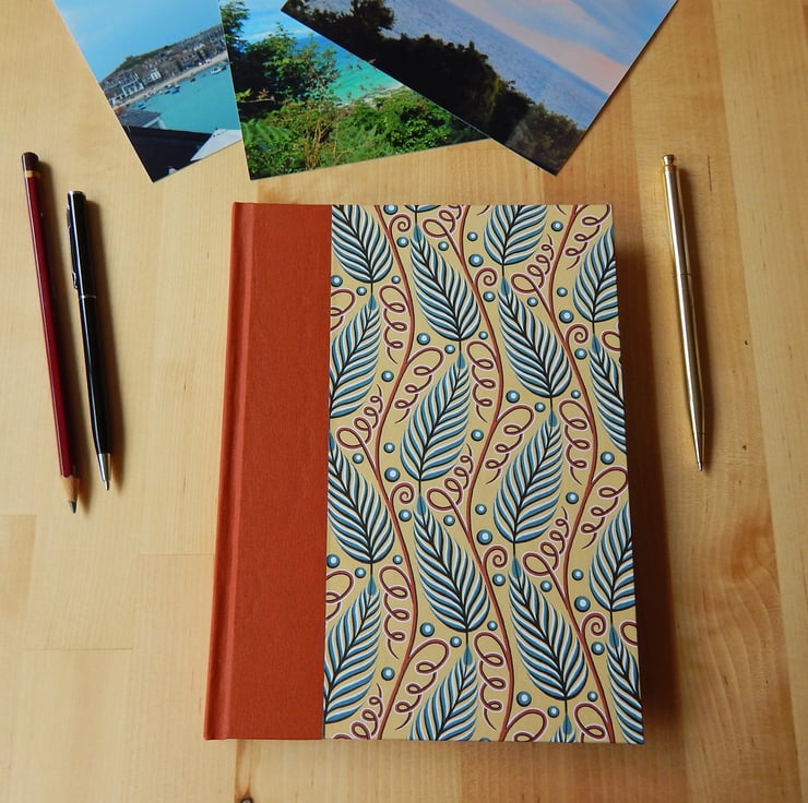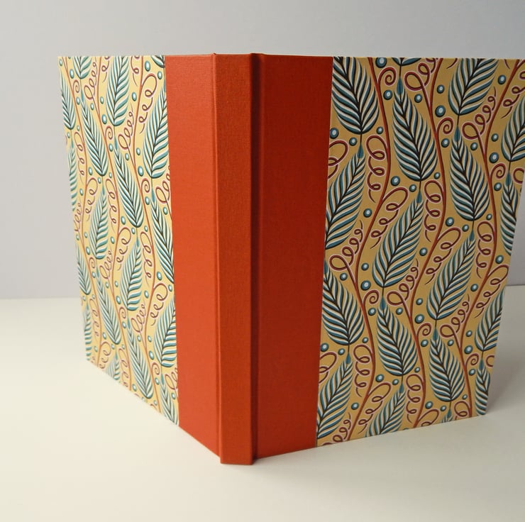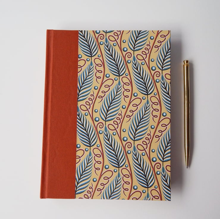 The journal is a traditional hand made hard cover book. It has covers of board, with a stylish leaf and vine paper, designed by artist Cressida Bell, in terracotta and blue-green, with black & white details, on an ochre yellow background.