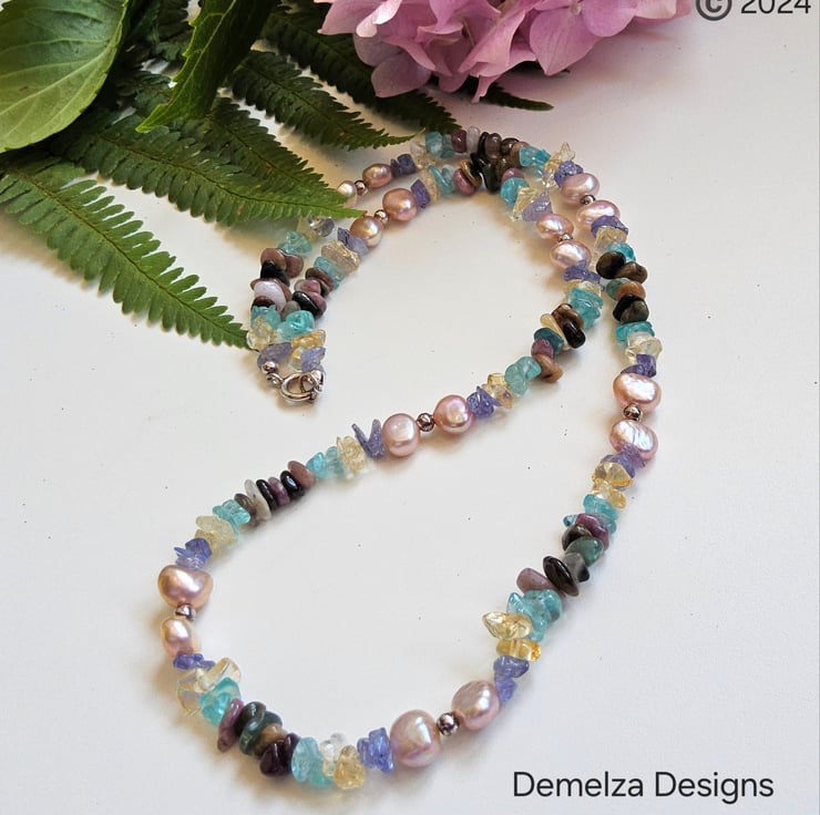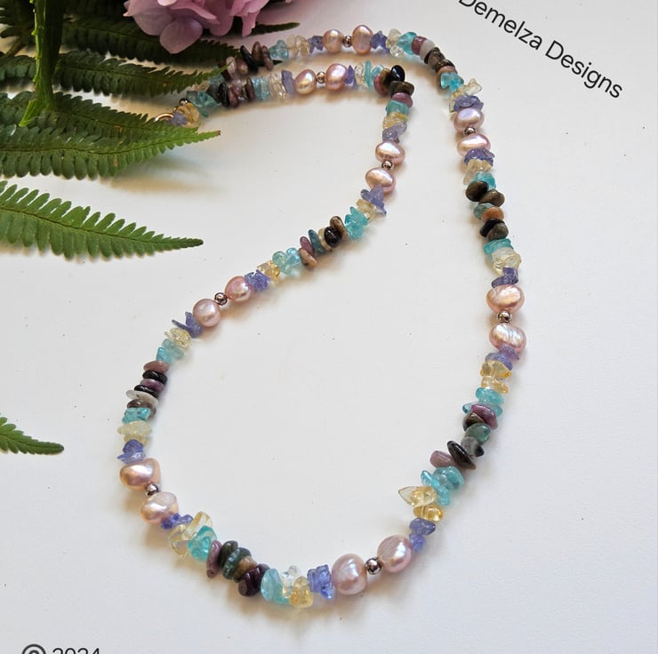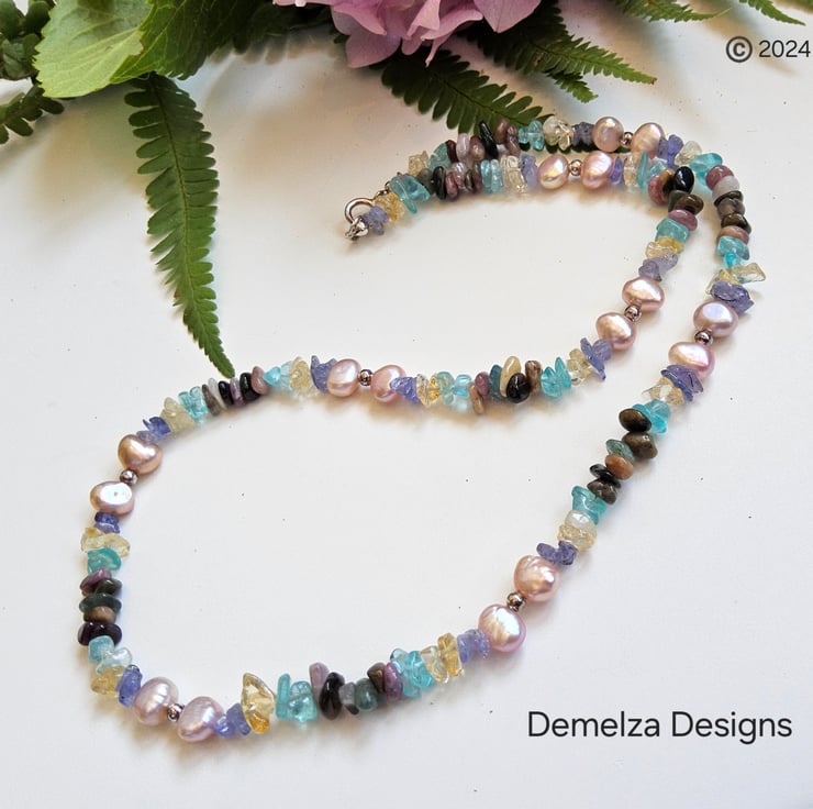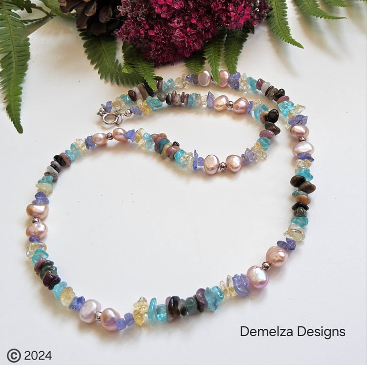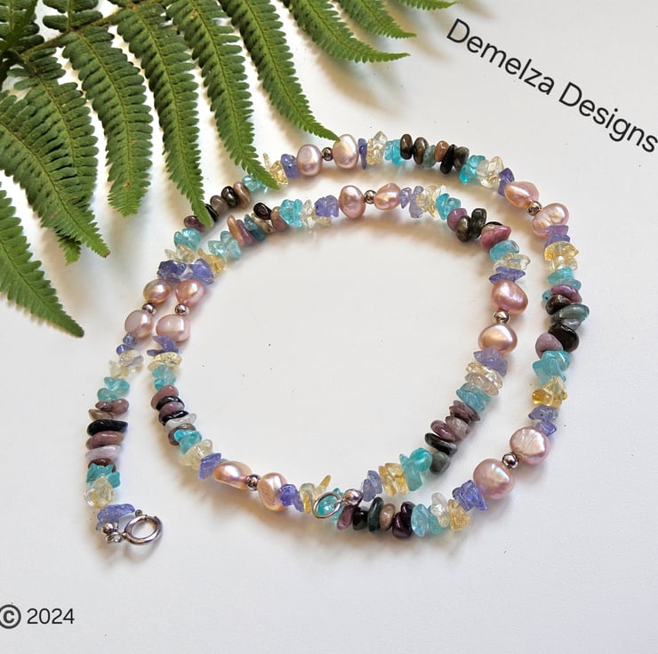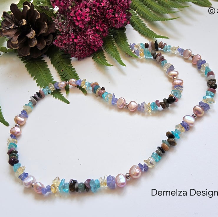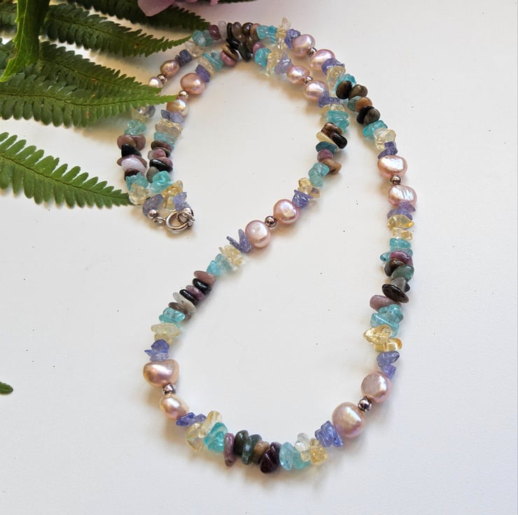 A sweet multi gemstone necklace designed and crafted using a mix of tanzanite, tourmaline, citrine, apatite and freshwater culture borgue pearls complimented with 2mm sterling silver beads. For the main construction professional flexible stainless steel jewellers wire has been used for added strength and lasting durability, finished off with a 925 sterling silver bolt ring clasp.