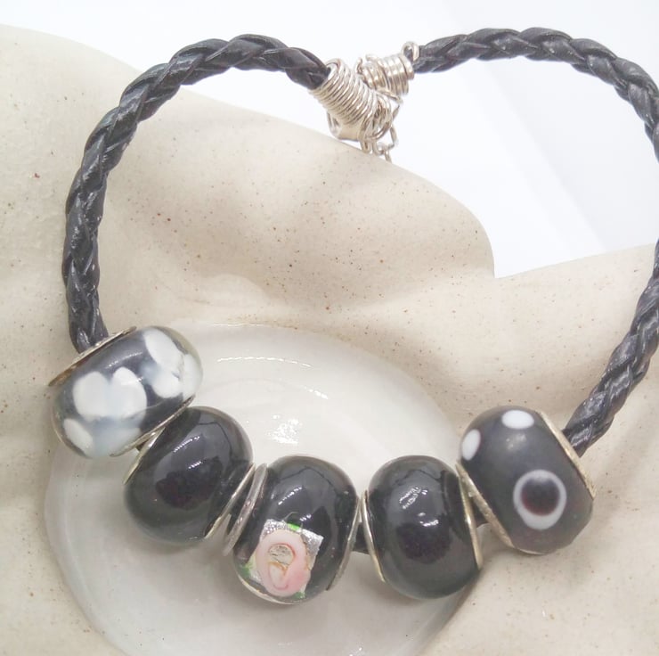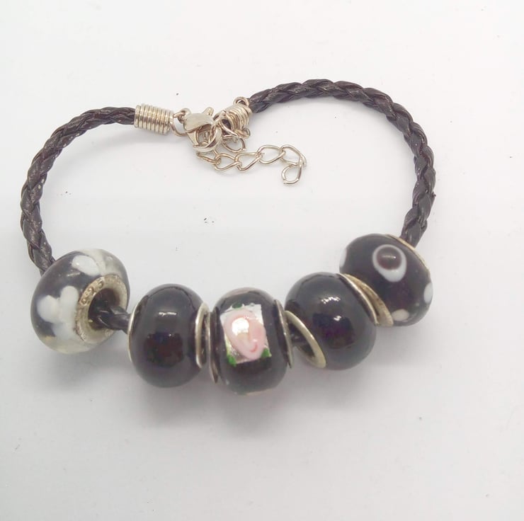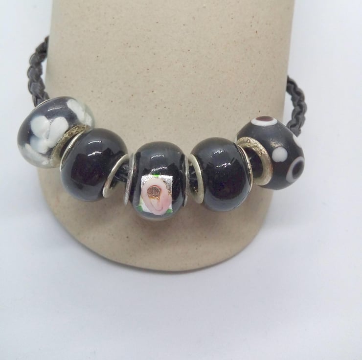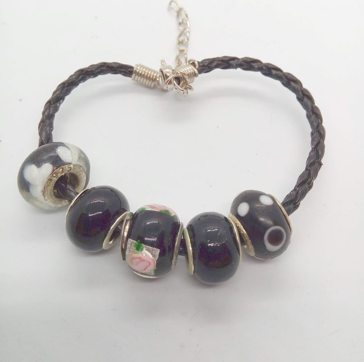 Black European Lampwork Bead Bracelet on a Black Plaited Leather Band, Jewellery, Gift, Birthday, Christmas, Accessories, Gift For Friend