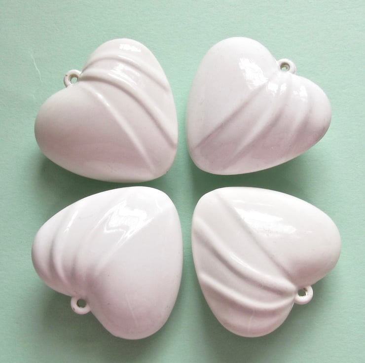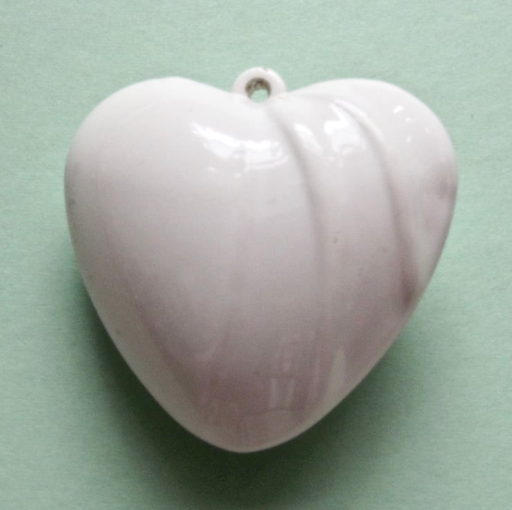 This is an attractive large, puffy white acrylic heart pendant. There are ripples on the right half of the heart that catch the light and cause the pendant to shimmer. The front pattern is the same as the back, meaning that the pendant is reversible.