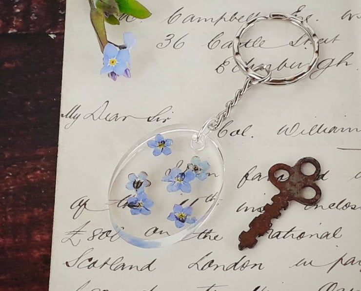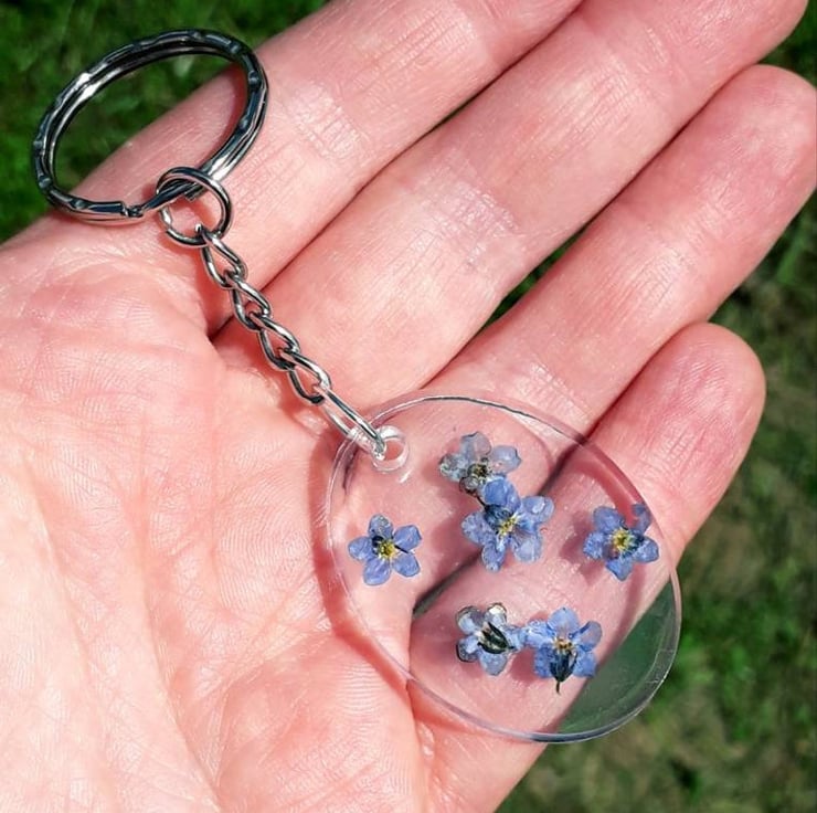 To made this keyring I collect flowers and dry them in flower press, them sealed them in non toxic Low Viscosity Ultra-Clear art resin.