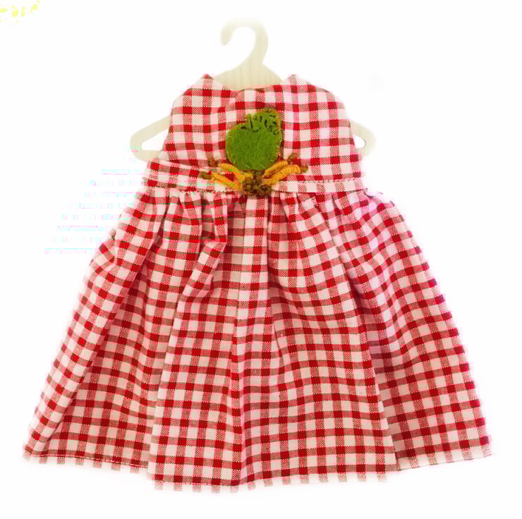 A sweet little red gingham dress to fit the Mulberry Green characters. The dress is made from best quality cotton, has a full skirt and a lined bodice and is decorated on the front with a green apple and embroidered straw.. It comes on a cute little wooden hanger.