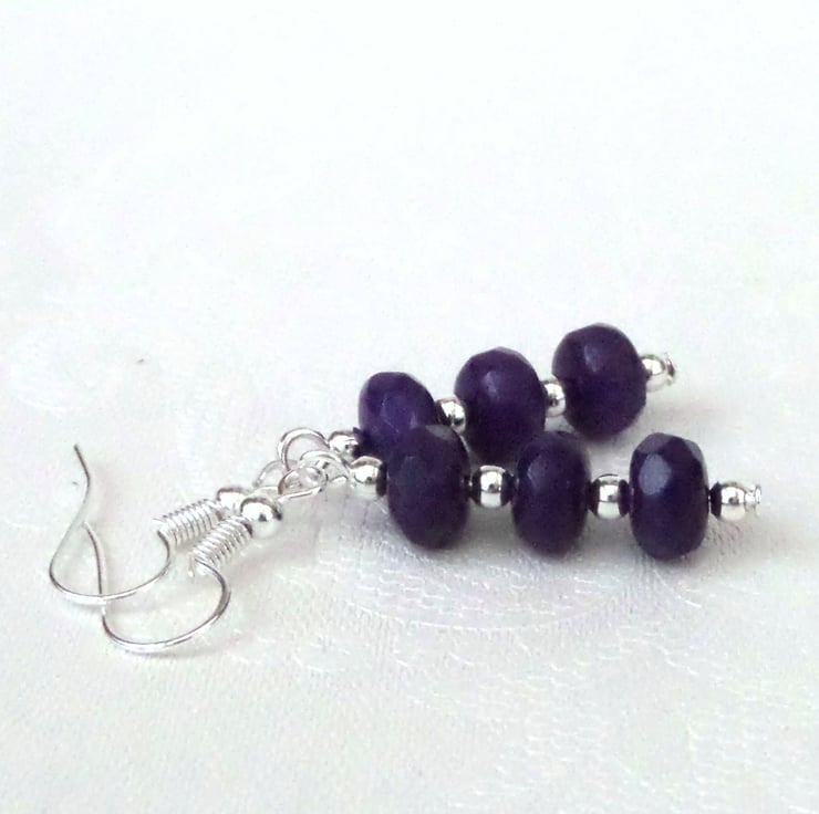 Three jade rondelles hang with little silver coloured beads from your choice of sterling silver or silver plated wires in these pretty dangly earrings.