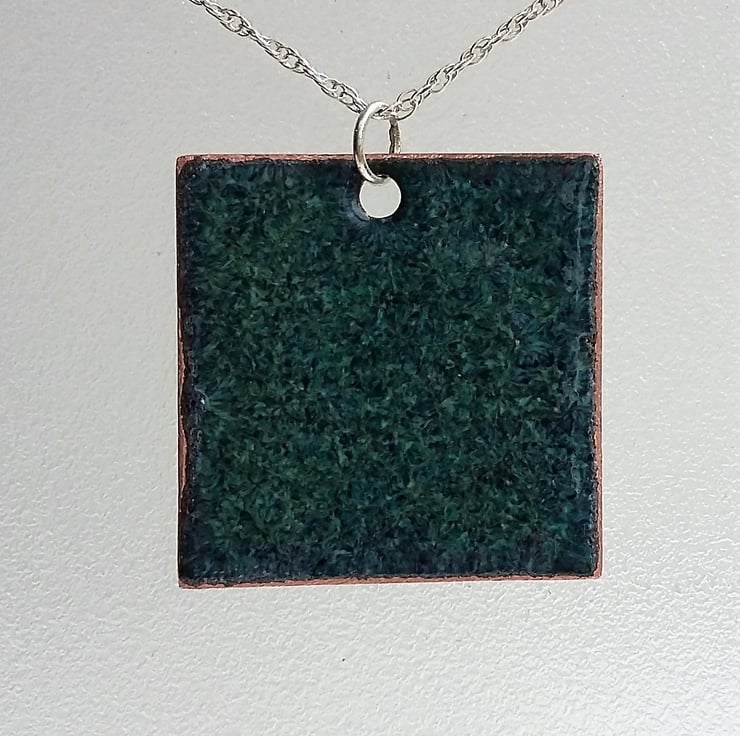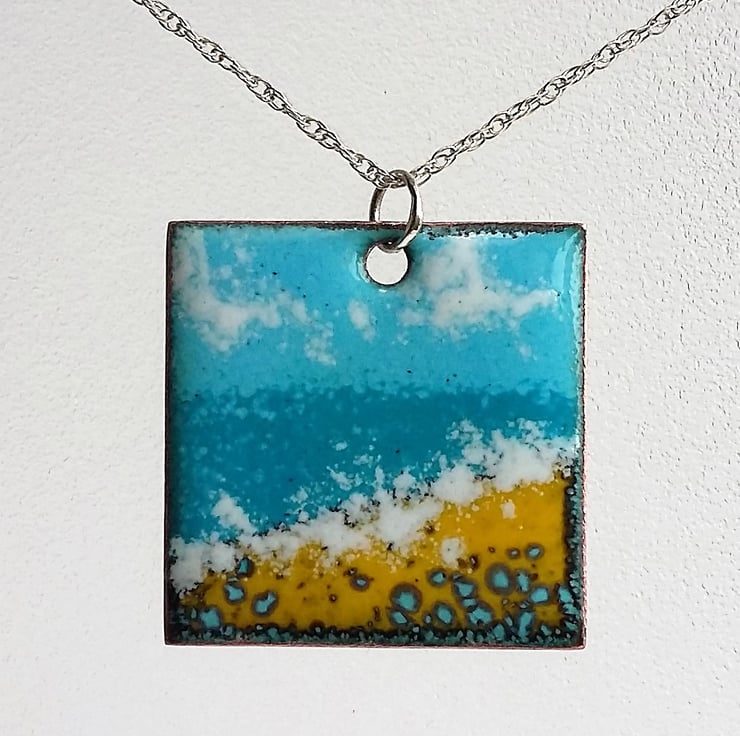 Square enamelled copper pendant with a design of sky, sea, surf and sand. The pendant has been kiln-fired and measures approximately 31mm square. To complete the piece aesthetically and for a smooth finish against the skin, the back has been given two coats of dark blue tweed-effect enamel. It comes complete with an 18” sterling silver rope chain with a soldered sterling silver jump ring and is supplied with a little organza pouch. POSTAGE IS FREE!