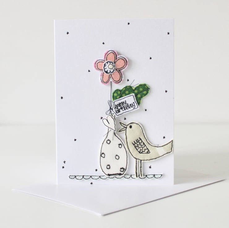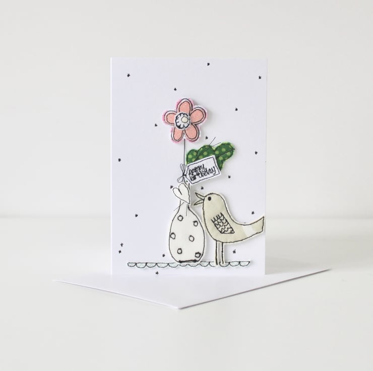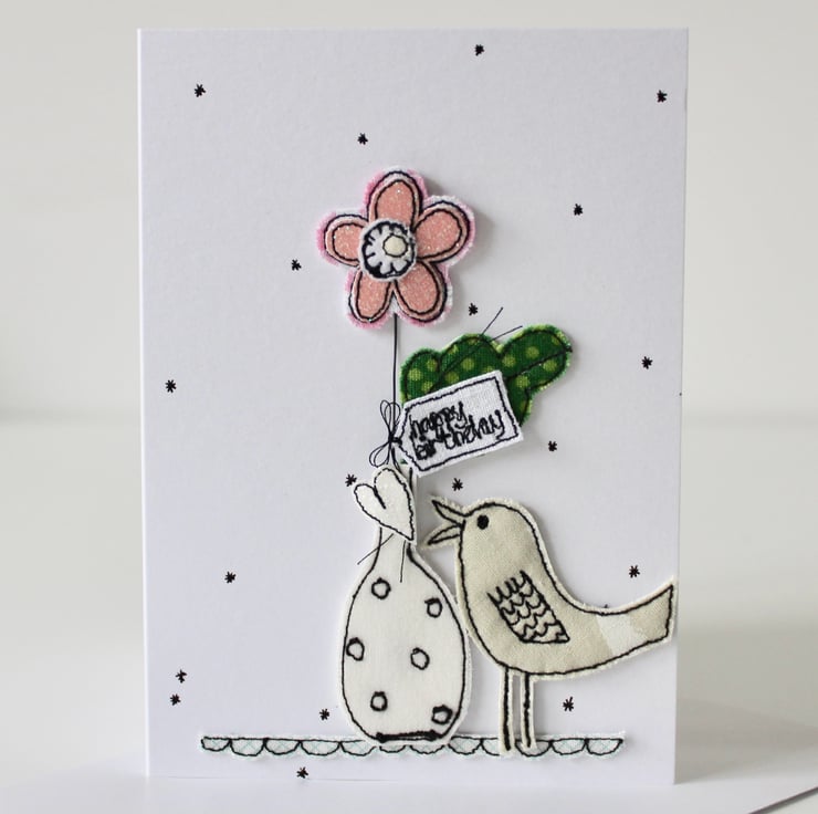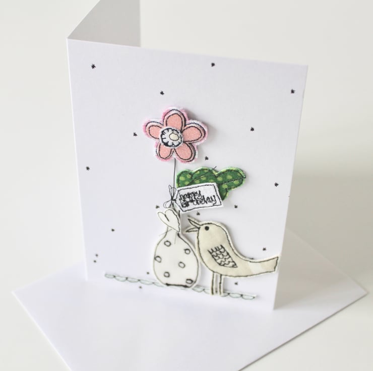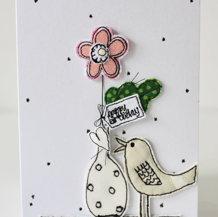 A little birdie is singing a heart, whilst standing next to a bloom in a vase, with a sewn label 'happy birthday' with hand drawn stars all around. A beautiful card to keep and treasure.
