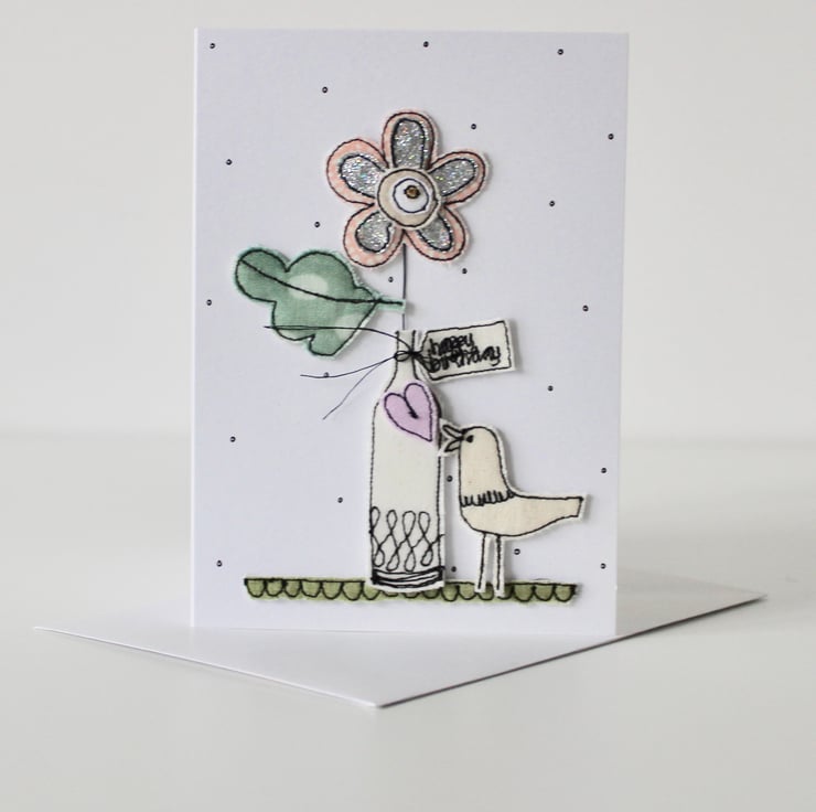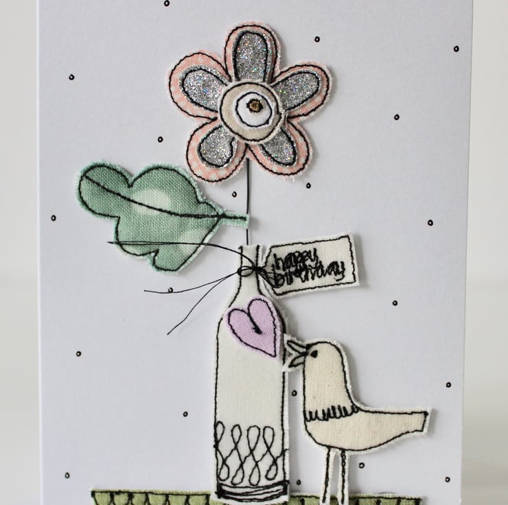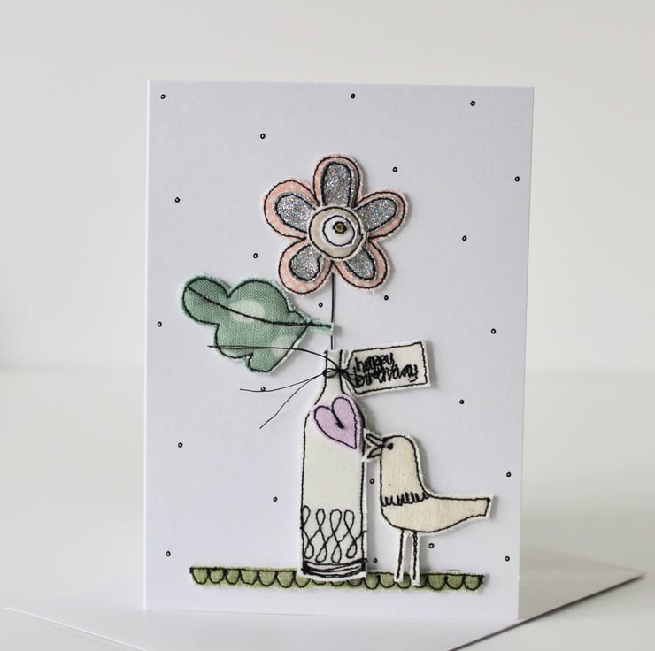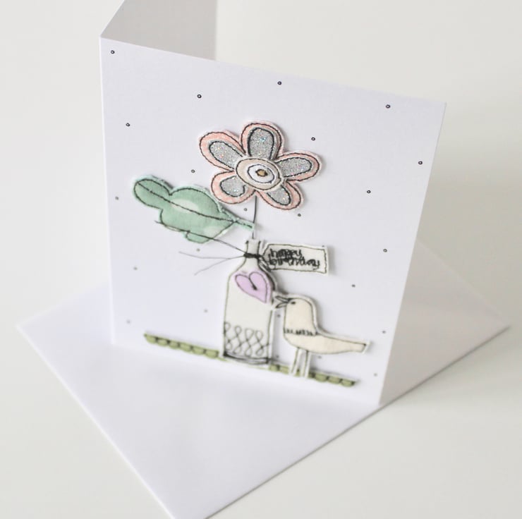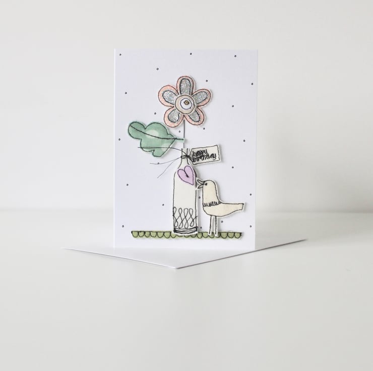 A little birdie is singing a heart, whilst standing next to a bloom in a vase, with a sewn label 'happy birthday' with hand drawn bubbles all around. A beautiful card to keep and treasure.