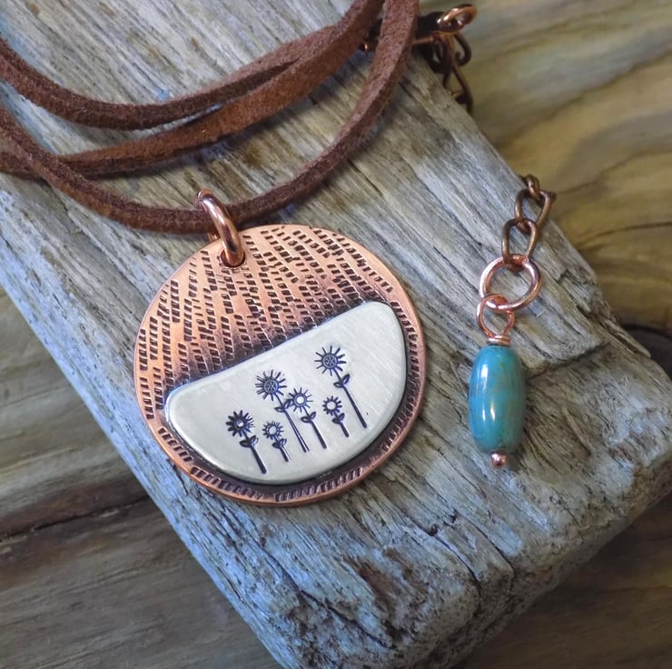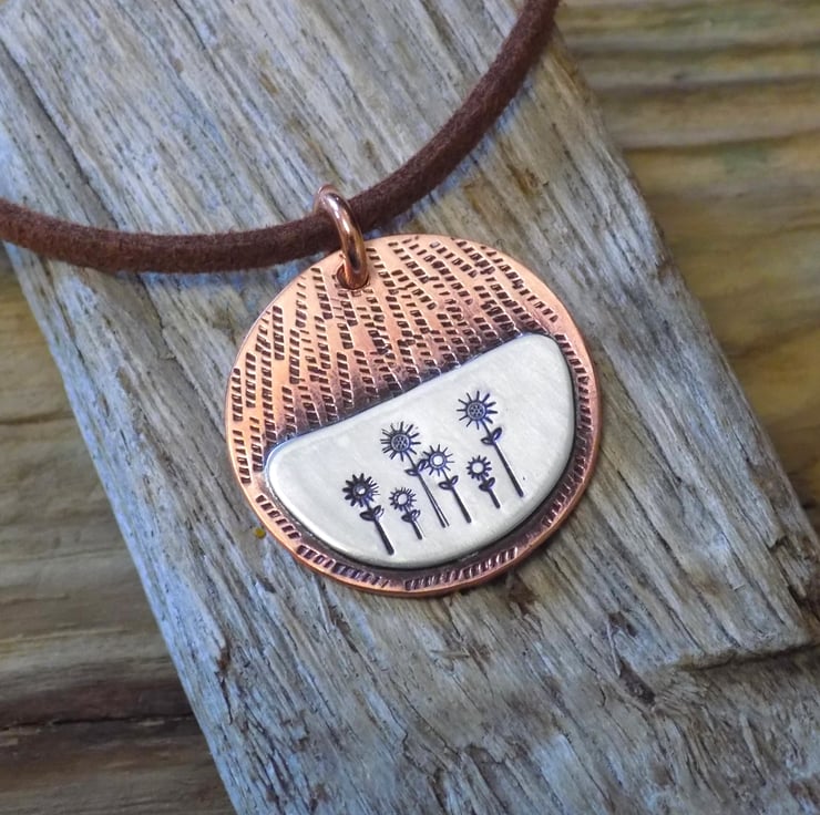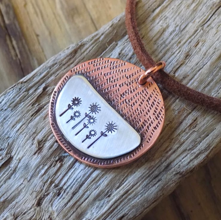 This pendant has been made from thick 1.2mm copper sheet and sterling silver sheet. The silver has been carefully soldered on to the front of the copper which has been stamped with a lovely flower design. The whole pendant has been given an aged effect which picks out all the detail and texture creating a lovely contrast between the silver and copper. Simply hung on a faux suede cord measuring from 16-18 ".