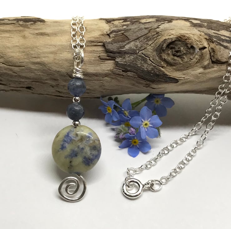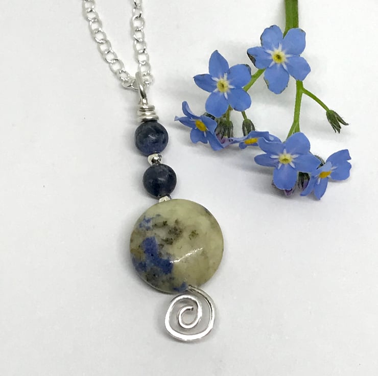 Simple elegance, this pretty sodalite gemstone pendant is handmade with sterling silver wire. These beautiful gemstone beads have a lovely mix of blues and creams. A unique pendant to wear on any occasion and a perfect gift for someone specia.