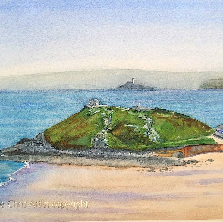 Based on my own photograph, this is a view of the beautiful Porthmeor Beach at St. Ives in Cornwall. It features the dramatic headland known as "The Island", with Godrevy Lighthouse in the distance.The view was taken from the hill at Ayr Terrace, St, Ives.
