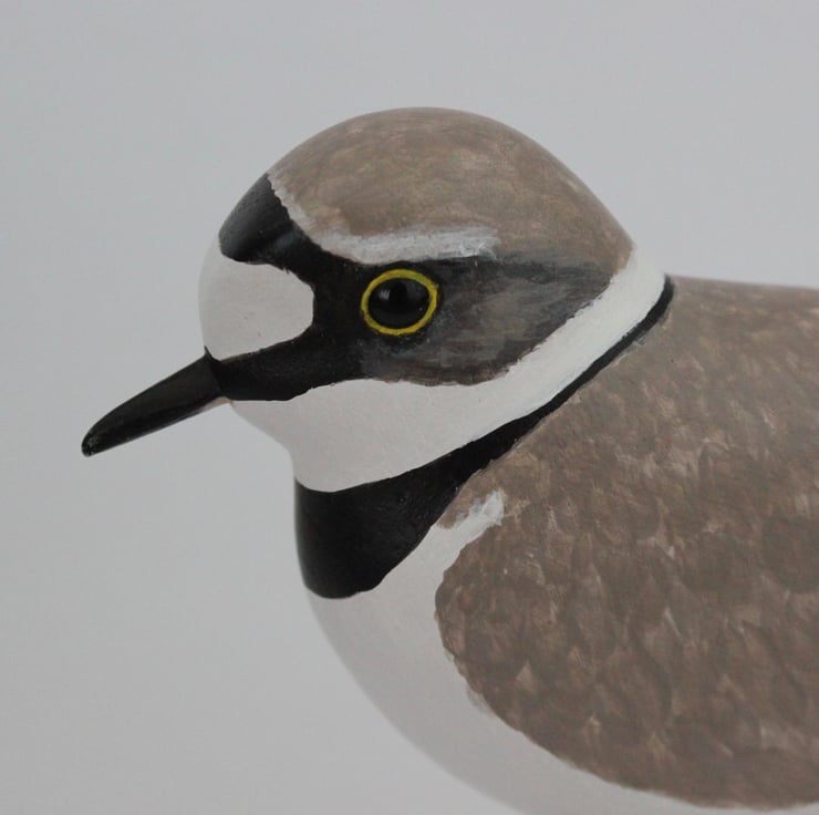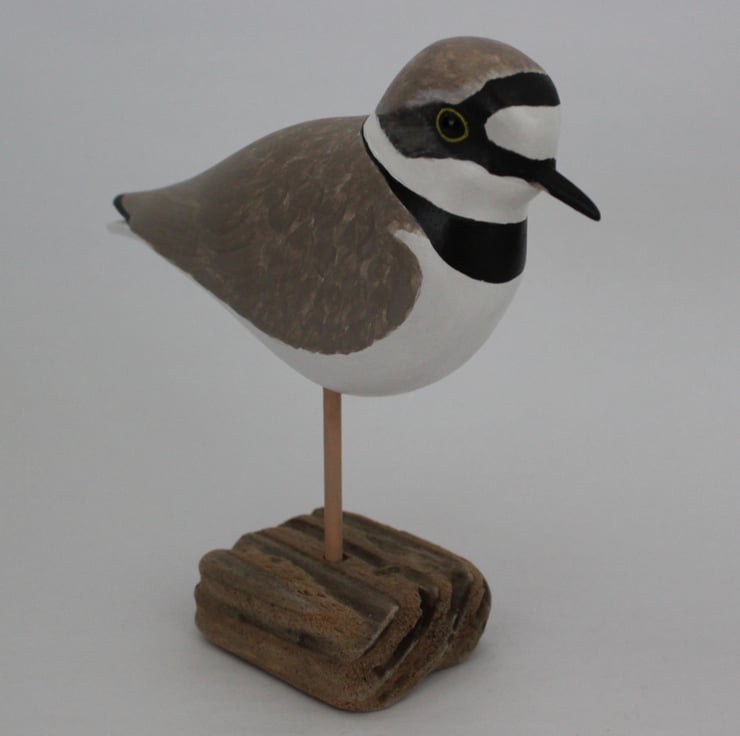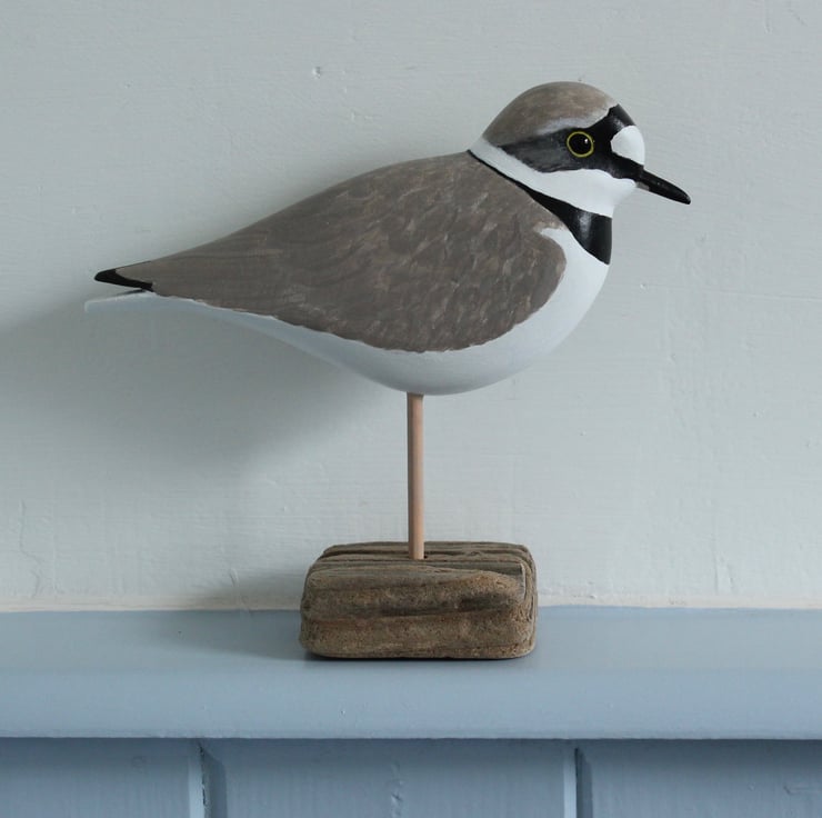 I have hand carved this little ringed plover and mounted it on a little square of driftwood. It has black glass eyes, split tail detail and I have painted it with artists acrylics and finished it with wax giving a soft shine.