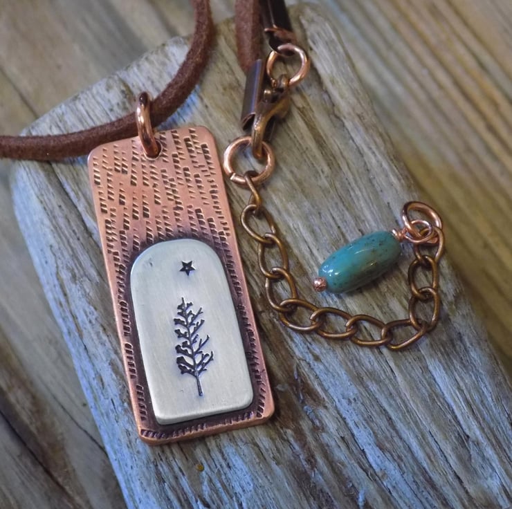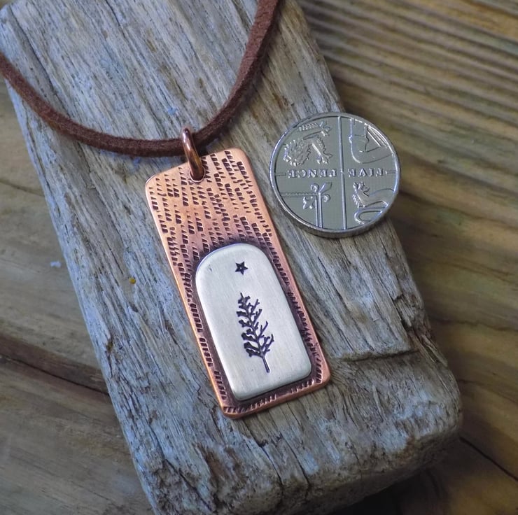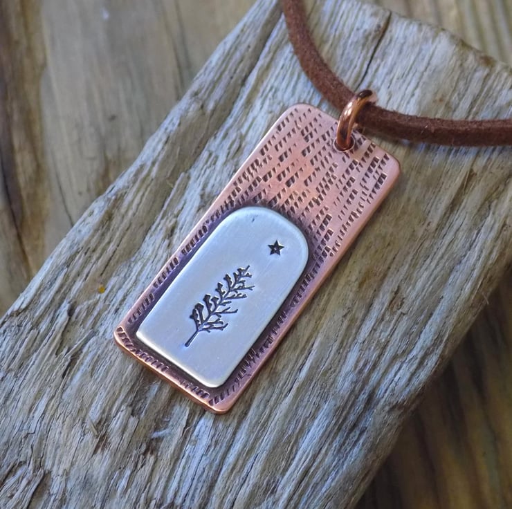 This pendant has been made from thick 1.2mm copper sheet and sterling silver sheet. The silver has been carefully soldered on to the front of the copper which has been stamped with a pretty tree and tiny star design. The whole pendant has been given an aged effect which picks out all the detail and texture creating a lovely contrast between the silver and copper. Simply hung on a faux suede cord measuring from 16-18 ".
