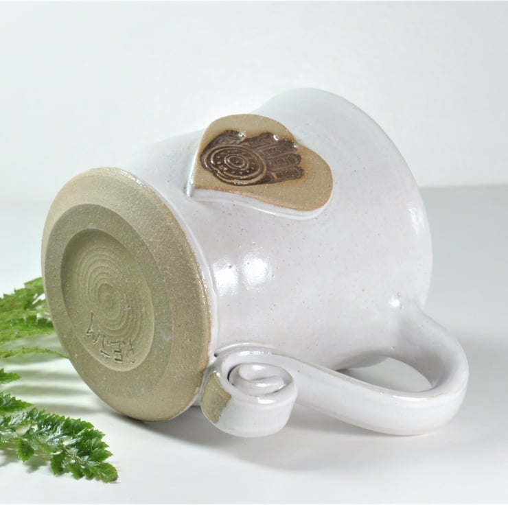 This mug has a heart shape with the Hand of Hamsa imprinted into it.