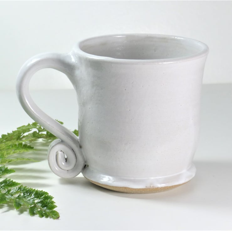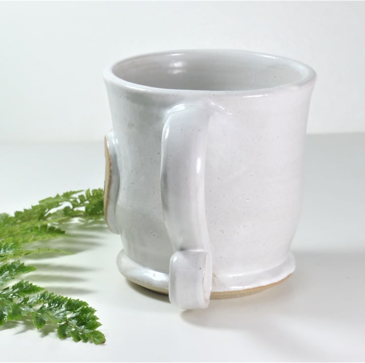 The mug was then fired to 1000C to what is called bisque ware. The base and design were waxed and I then glazed the mug by dipping it in this wonderful white glaze. It was then refired to 1240C. That's hot!