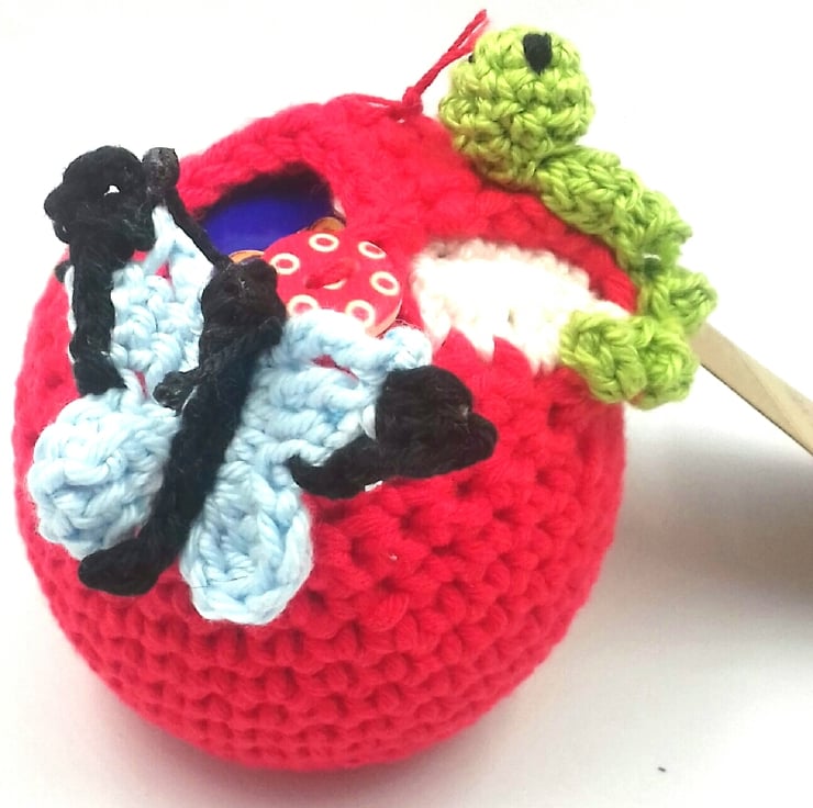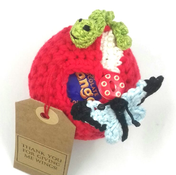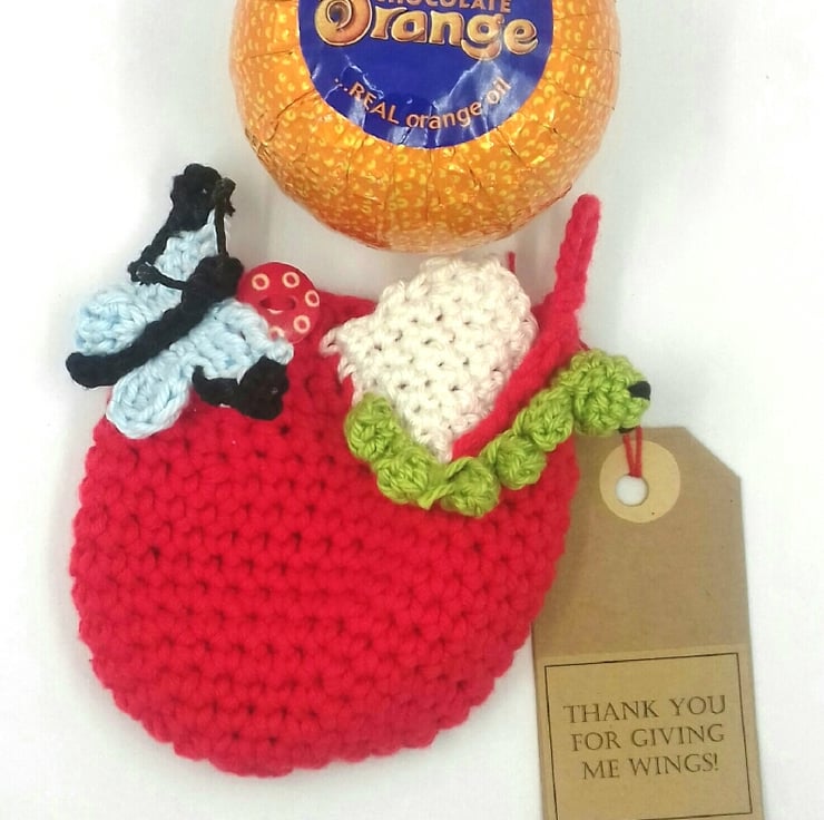 This apole would make a novel way to thank all special, nurturing teacher. It is crocheted in a lovely soft cotton and acrylic blend and designed to contain a chocolate orange or maybe a tennis ball for a PE teacher! Afterwards it is perfectly for storing the teacher's playtime apple and keeping it bruise-free! It features a cheerful caterpillar emerging from the hole it'sounds nibbled and the beautiful pale blue butterfly it has become.