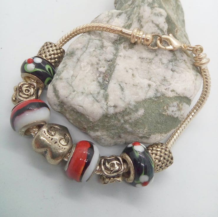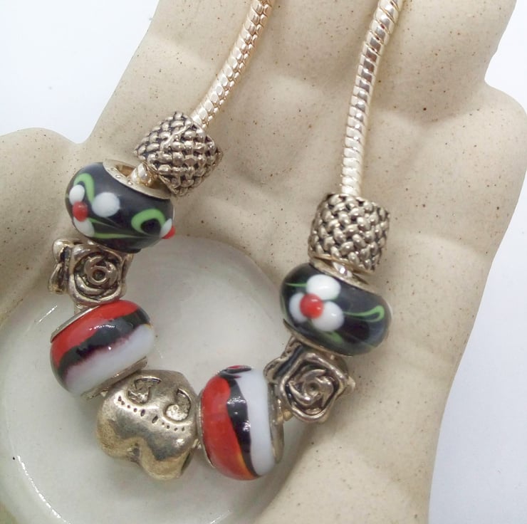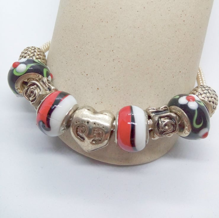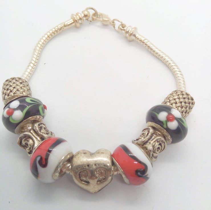 The bracelet is made using 12 mm Lampwork Glass Beads in black with white and green flowers and red and white, the silver plated charms are lattice patterned spacers, roses, and a heart, on a silver plated snake chain. Bracelet is 19 cm in circumference and has a silver plated lobster clasp.