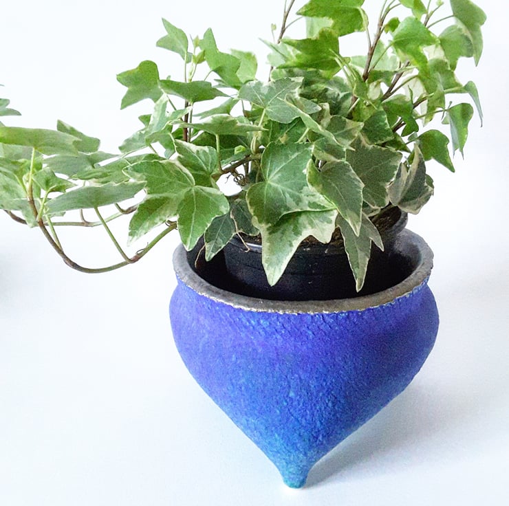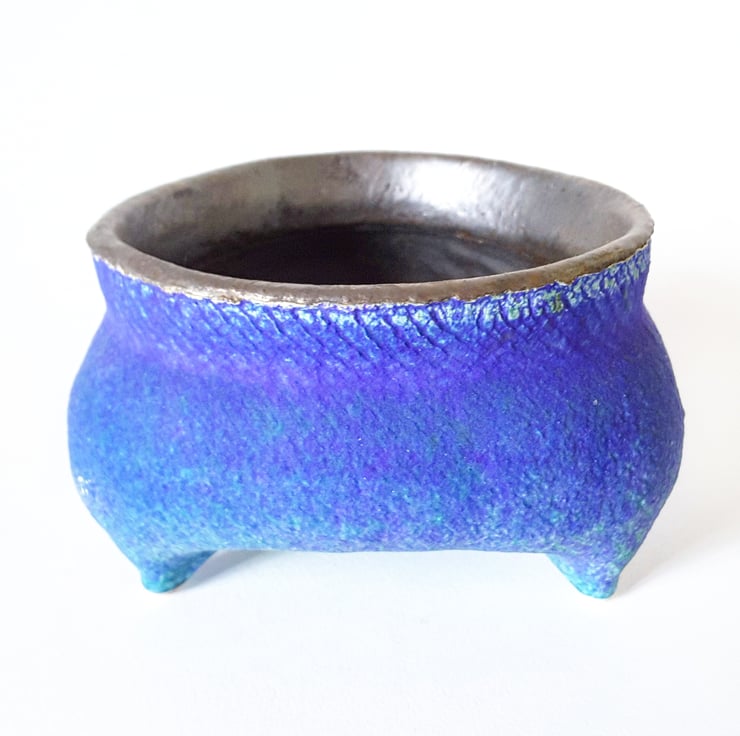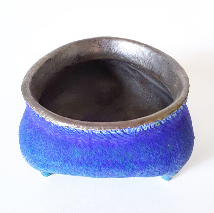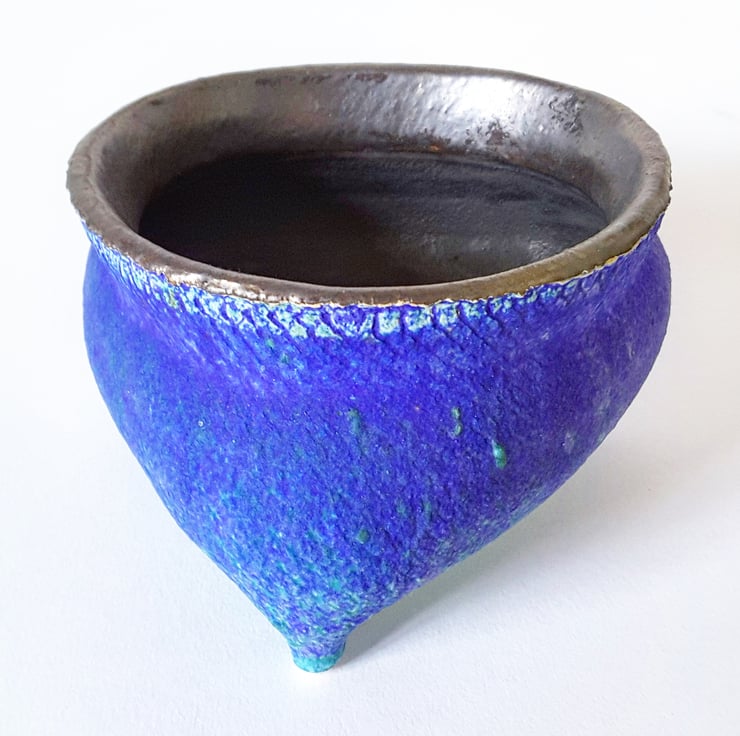 Glazed in a glorious matt blue glaze with a beautiful bronze lustre dripping from the top.