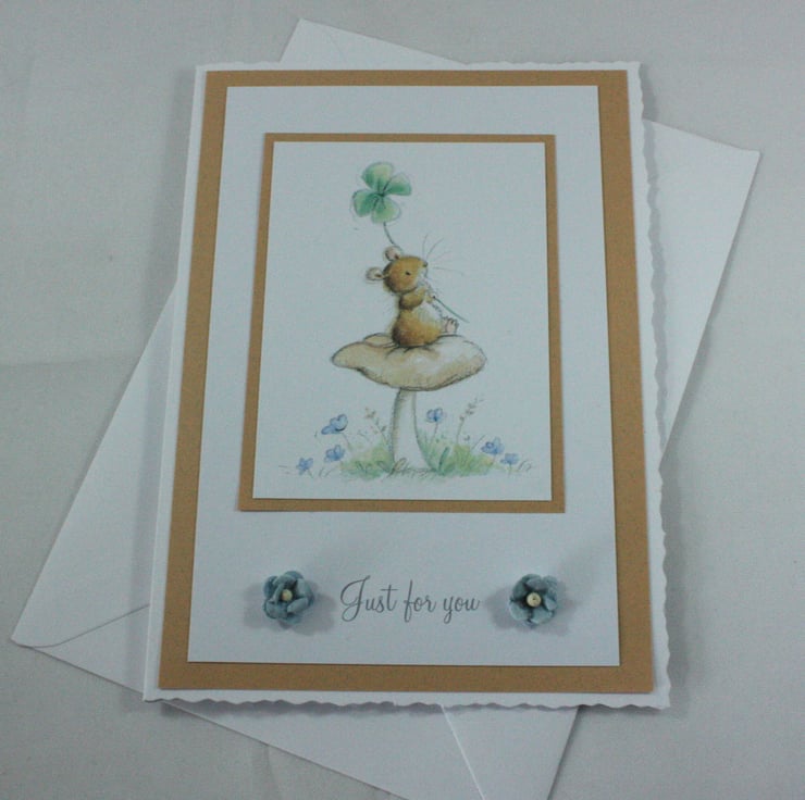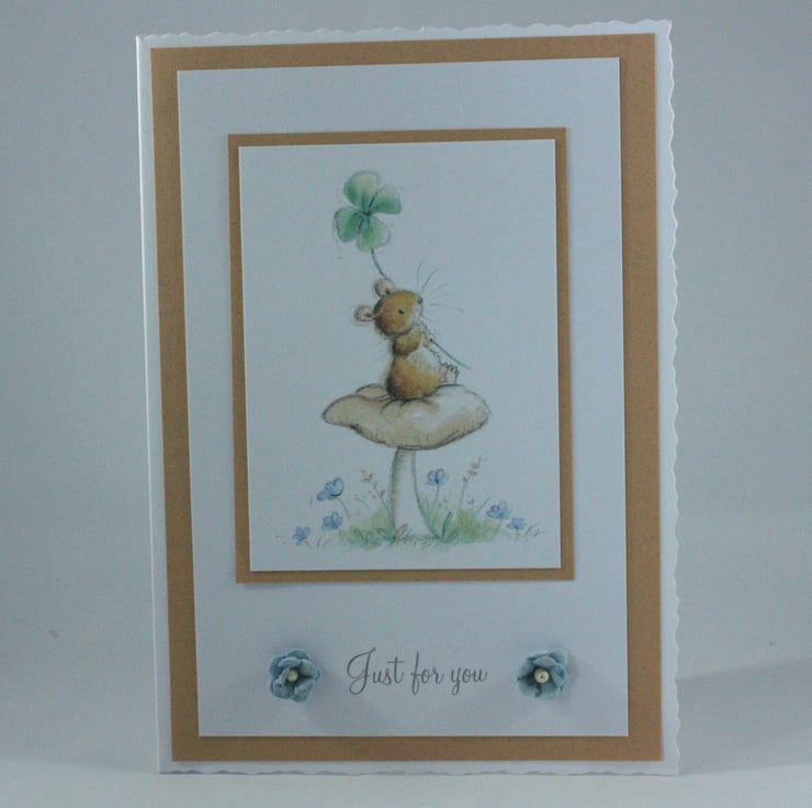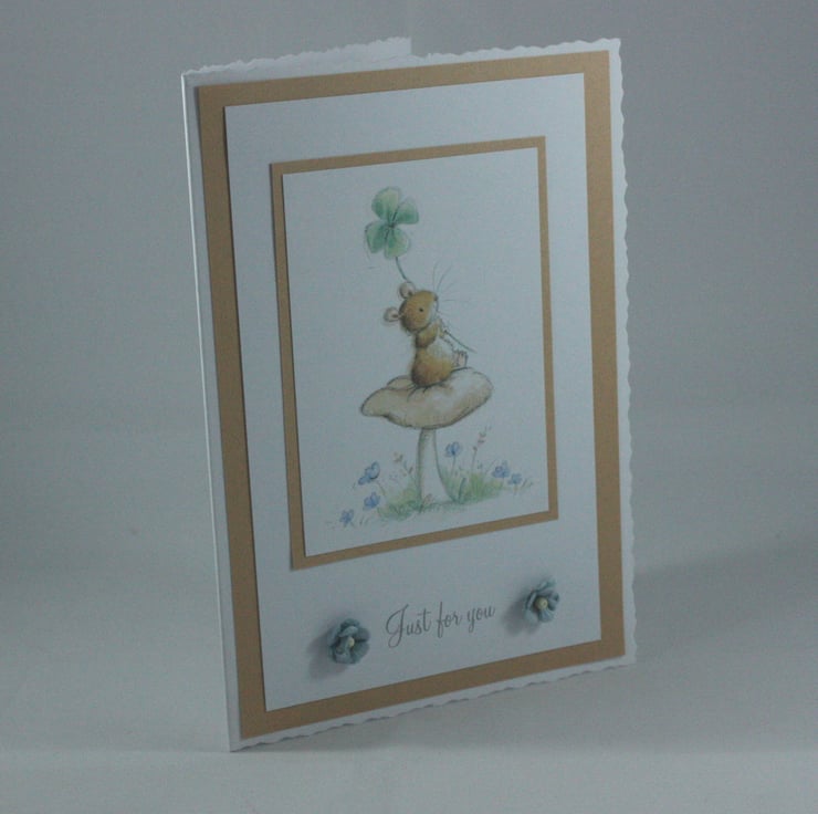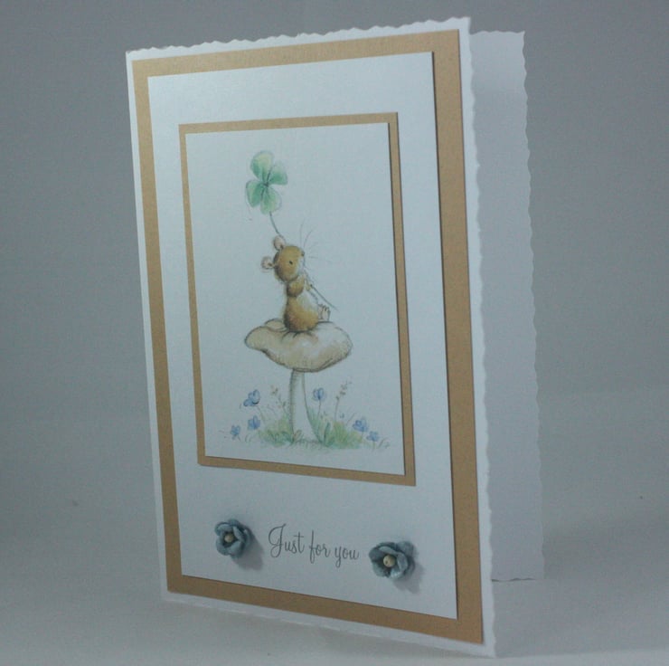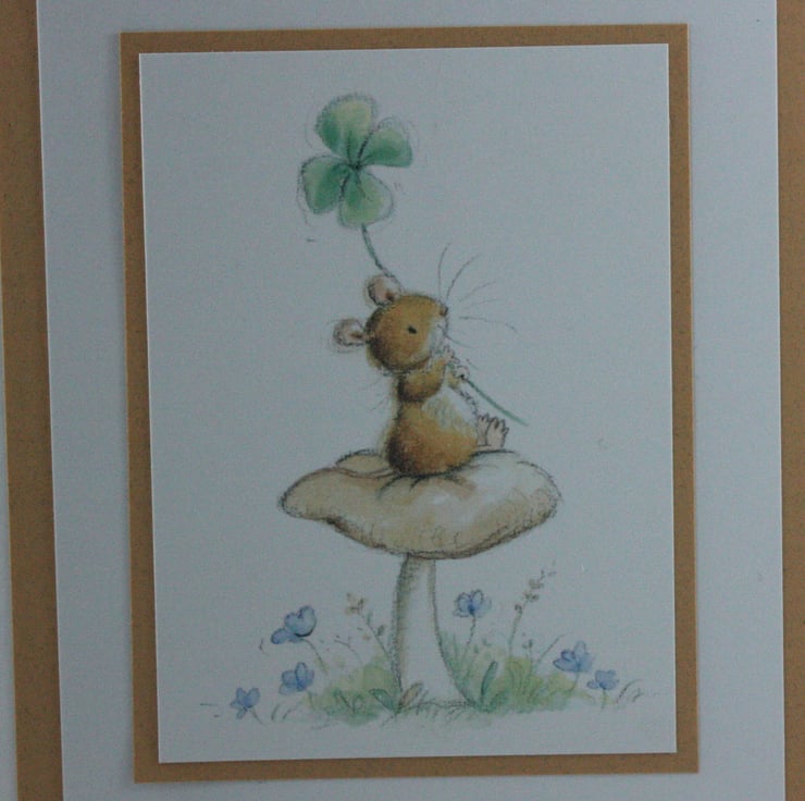 Small, deckle edged birthday card featuring a cute image of a mouse sitting on a toadstool with a four leaf clover. Could be used as a birthday card, get well or thank you.