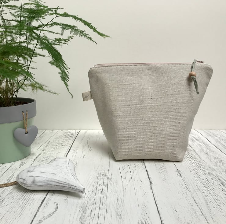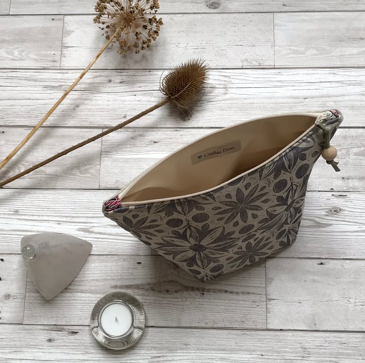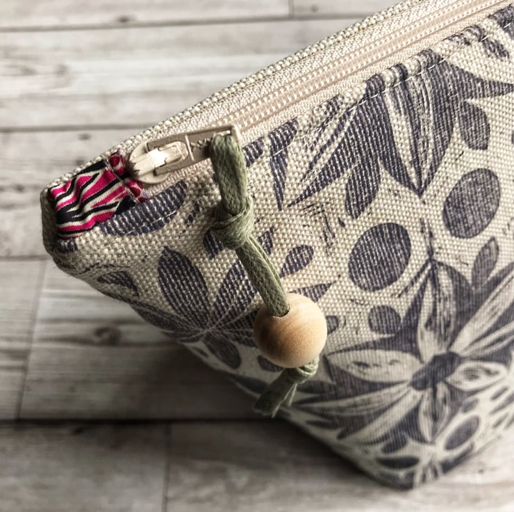 This unique design is block printed by hand using Eco-Friendly inks on to natural linen union fabric woven Scotland. The reverse is plain natural linen union. It is softly padded and lined with biodegradable waterproof calico, and the zipper finished with a pull made from waxed cotton cord and a natural wooden bead. Please note that the zipper ends may be a different fabric from that shown