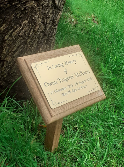 Natural Solid Oak Memorial Marker with beveled edges and attached stake.