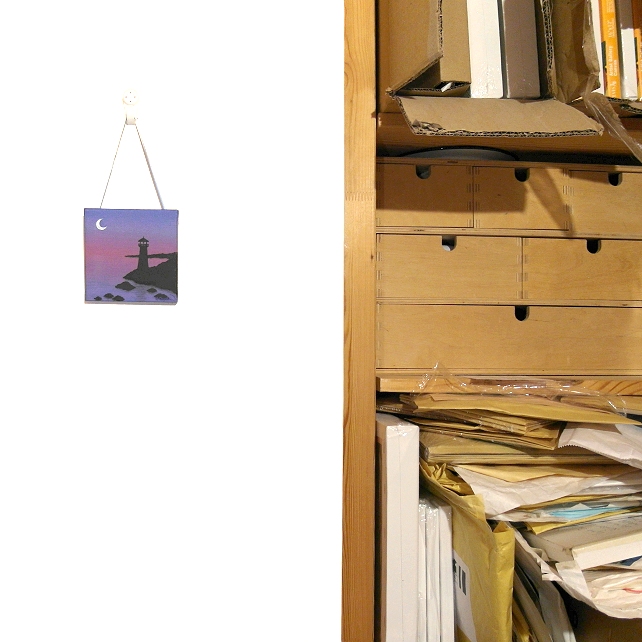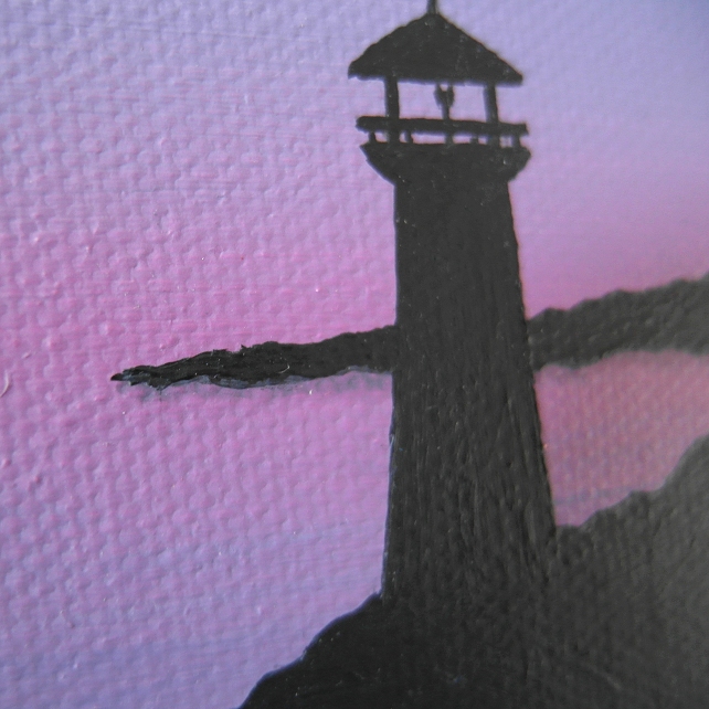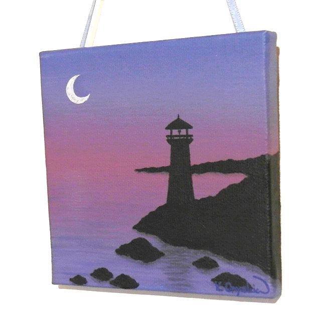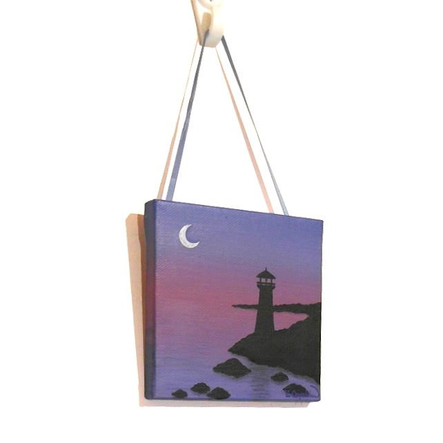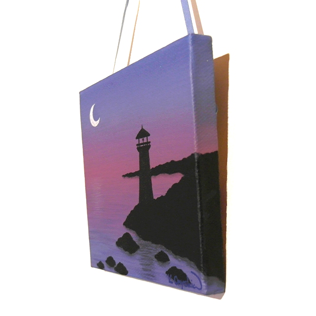 A small seascape painting featuring the silhouette of a lighthouse on a rocky shore. A pink and blue dusk sky is reflected in the sea, and a crescent moon shines above.