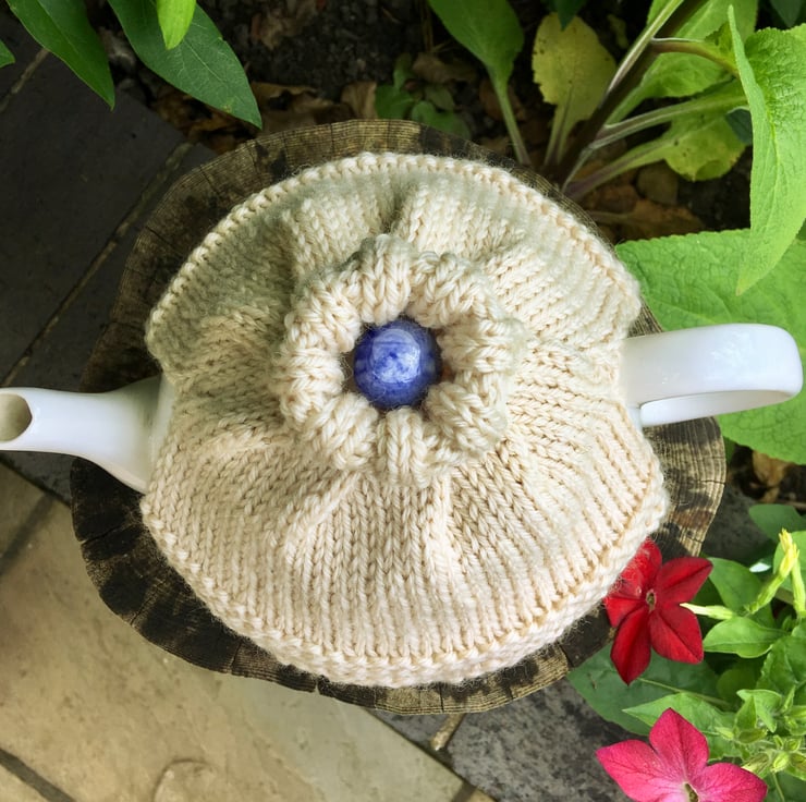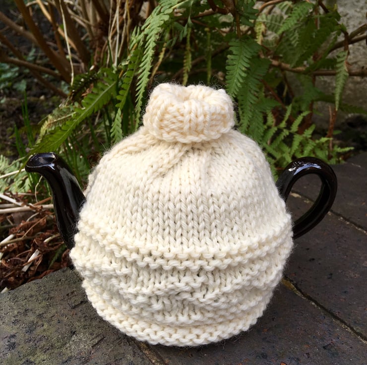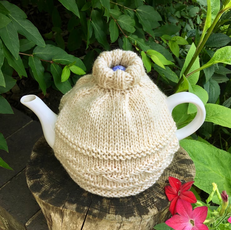 Hand knitted in a lovely merino wool aran yarn. The tea cosy will fit a standard 4-6 cup teapot and the roll brim bottom allows for different heights of teapot. The roll down neck can sit nicely around the top of a teapot lid.