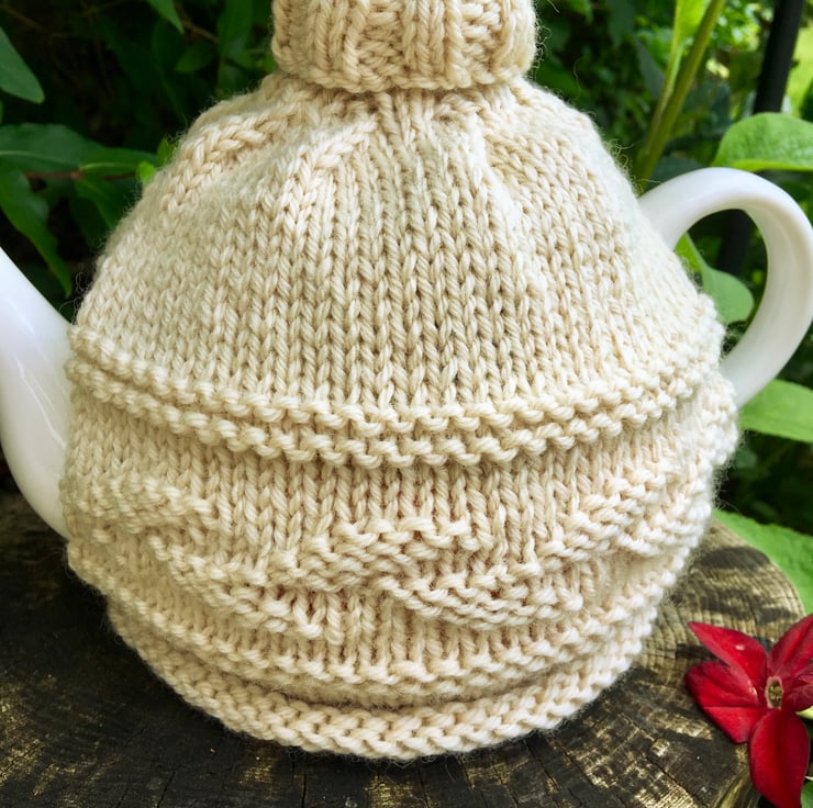 This lovely cream tea cosy is part of my new tea cosy range that has a lovely leaf design pattern running around the middle and a ribbed polo neck top.