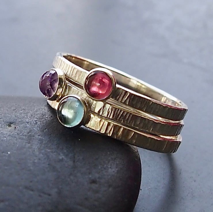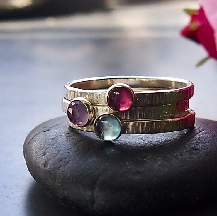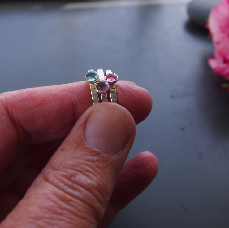 Bright pastels in the prettiest of summer shades. Here we have three sterling silver textured bands with a lilac amethyst facetted cabochon, a rose pink tourmaline and sky coloured topaz.