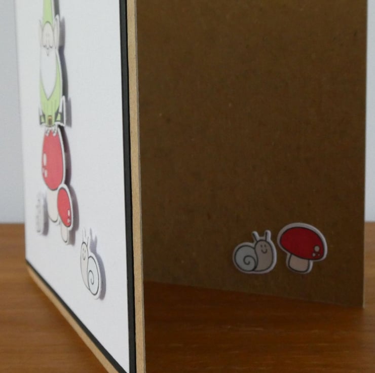 The images have been hand stamped and coloured and have been raised on foam pads to create dimension. The picture is finished with a black frame for definition and mounted on a brown kraft card.