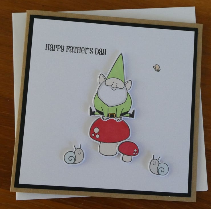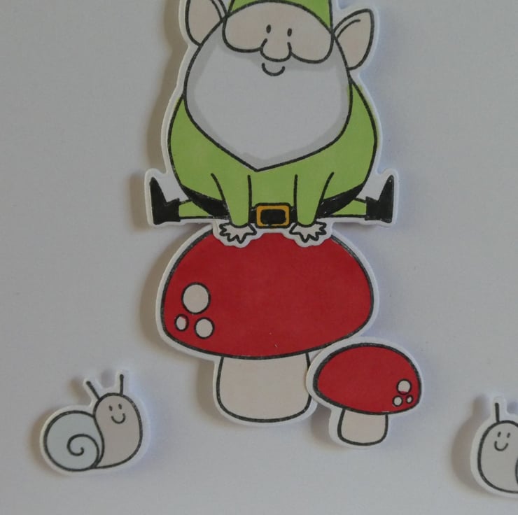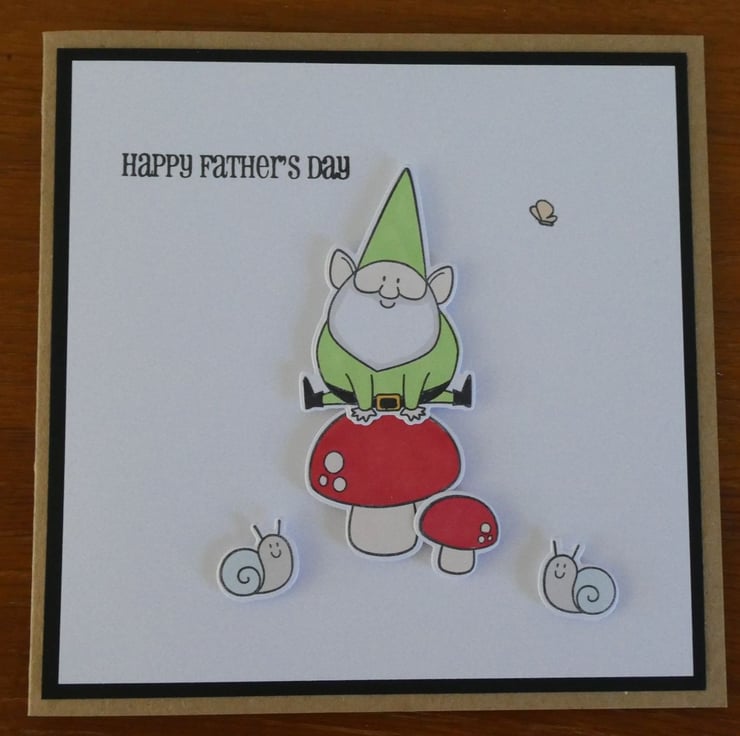 This Father's Day card shows a gnome leap frogging over a toadstool watched by two cute snails.