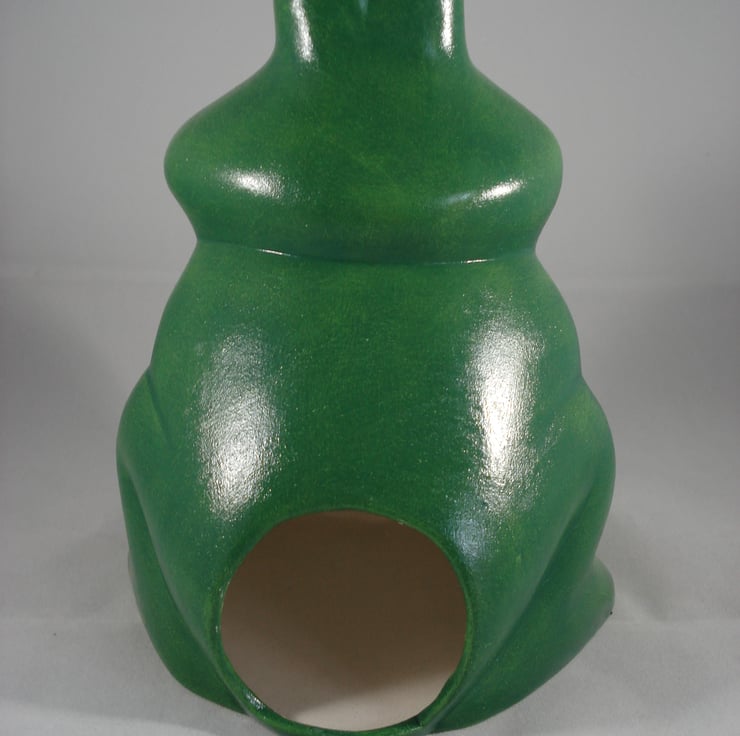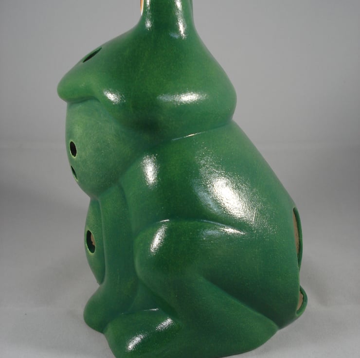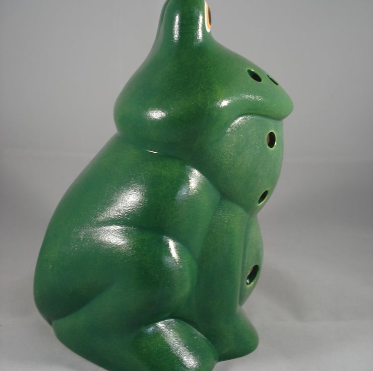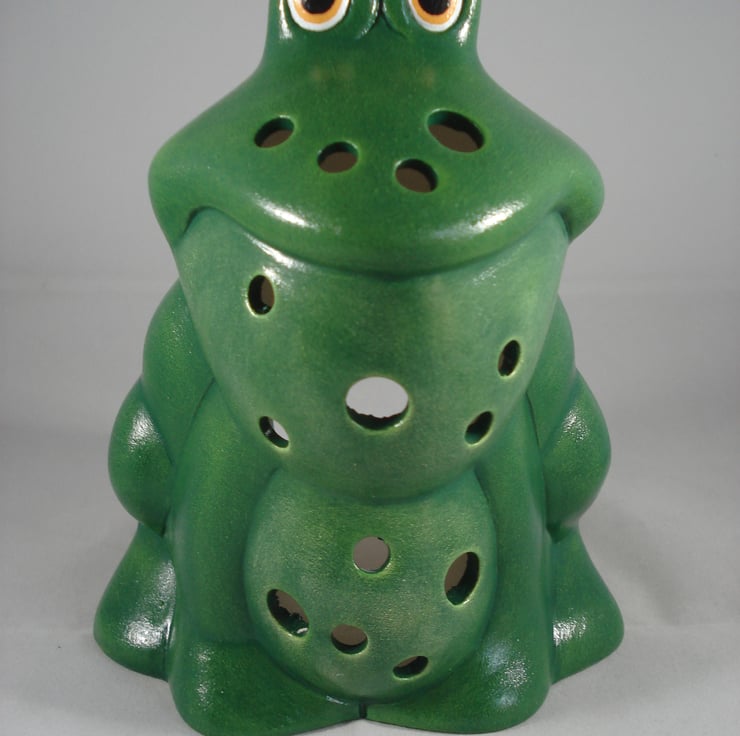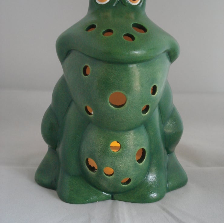 I have for sale a ceramic novelty candle/tealight holder, which was hand painted by myself. It is a green frog or toad figurine, which is sitting down. The item has small holes all over the front of it, in various different places, this allows the light from the candle to shine through. The back has a larger hole, for the small tealight to be placed inside of it. PLEASE NOTE: the battery operated candle in the photo, is not included in the sale, this was for display purposes only. This would make a fun and novel addition to anyone's home, garden or patio, or perhaps given as a gift.