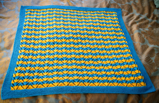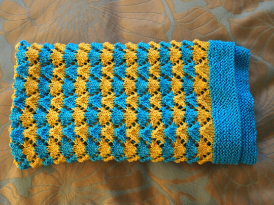 This baby blanket knitting pattern is a combination of stripes and lacework which forms a cheerful pram sized blanket. I happened to have some yellow and turquoise DK cotton and felt the combination to be very evocative of summer. Of course this will work just as well in one colour or alternative colour ways to those I've chosen. The size of the blanket is easily adapted by modifying the number of repeat stitches you cast on (10 stitches in the repeat) and adjusting the length you knit to.