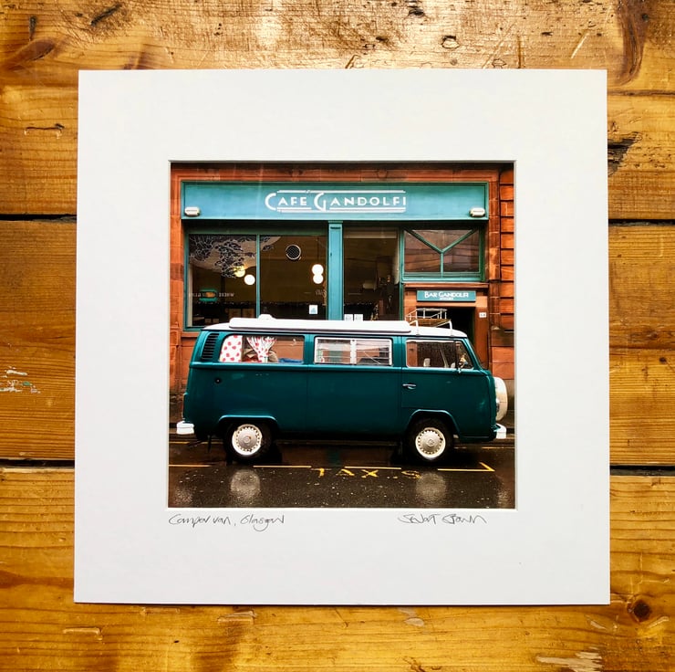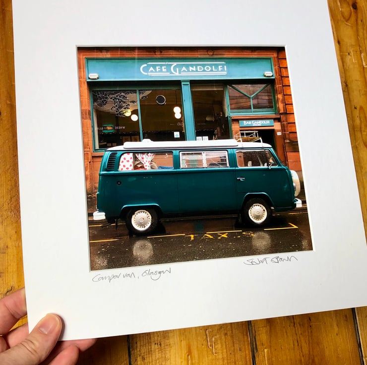 A signed mounted print of a classic camper van outside Cafe Gandolfi in Glasgow