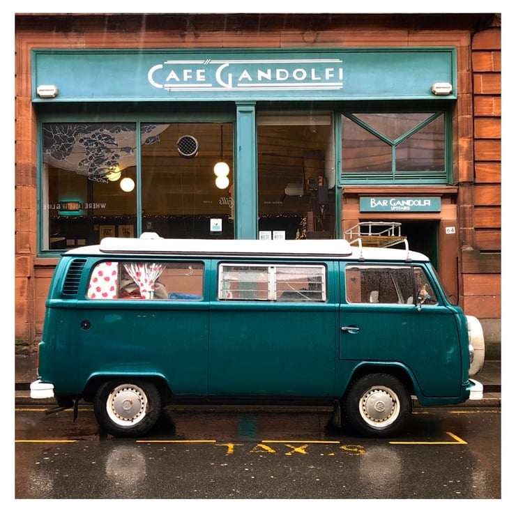 I recently spotted this gorgeous turquoise camper van in the Merchant City area of Glasgow and after chatting to the lovely owner managed to get this shot of it outside the institution which is Cafe Gandolfi - not easy as it was torrential rain at the time ( it was Glasgow in summer after all) . If you look closely you can make out the streaks of rain at the top of the picture
