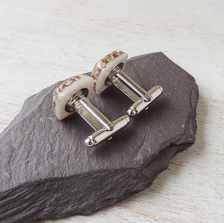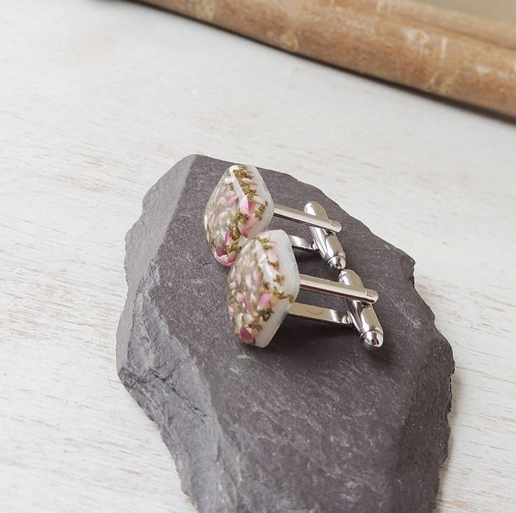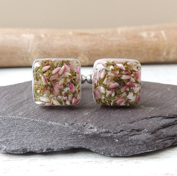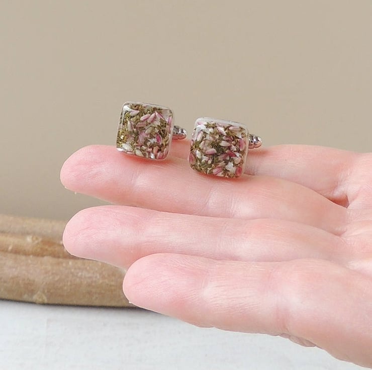 I made them with heather from my garden that I have picked and pressed to use in my resin flower jewellery. I have cast some of the dried flowers in square resin cabochons, finishing with a frosty white colour background. The silver plated cufflink setting has been embedded into the resin for additional security.